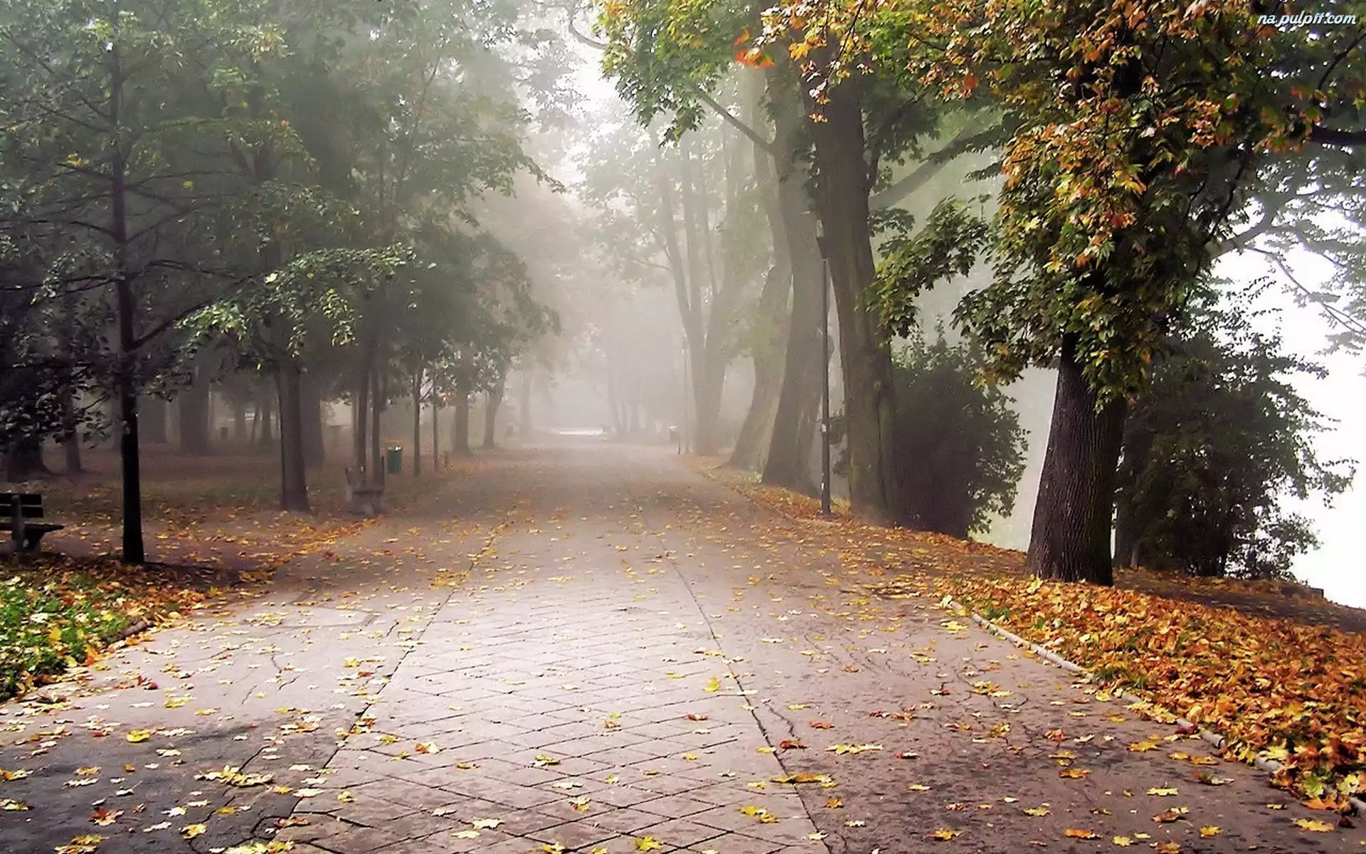 Chodnik, Liście, Mgła, Drzewa, Park, Ławki Na Pulpit
