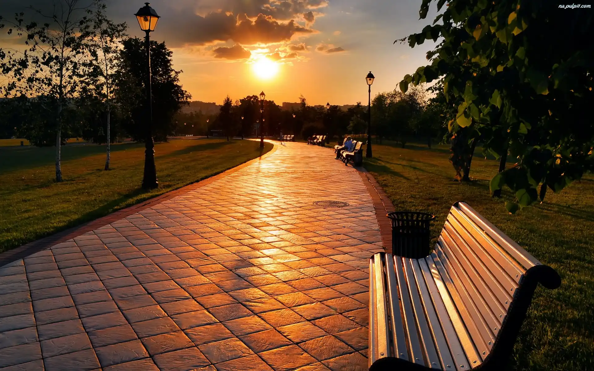 Chodnik, Słońca, Zachód, Ławki