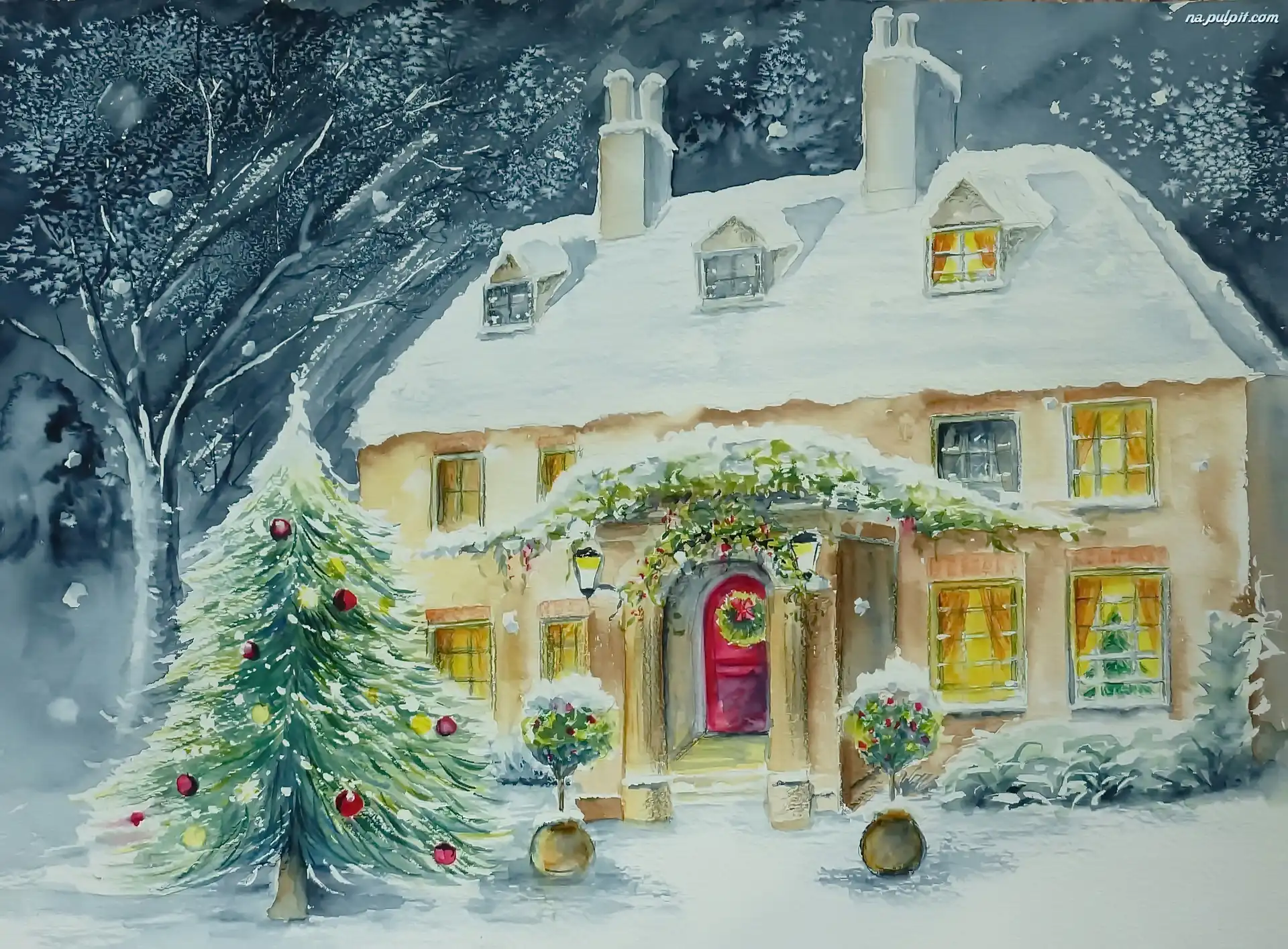 Choinka, Narodzenie, Malarstwo, Zima, Dom, Boże Na Pulpit