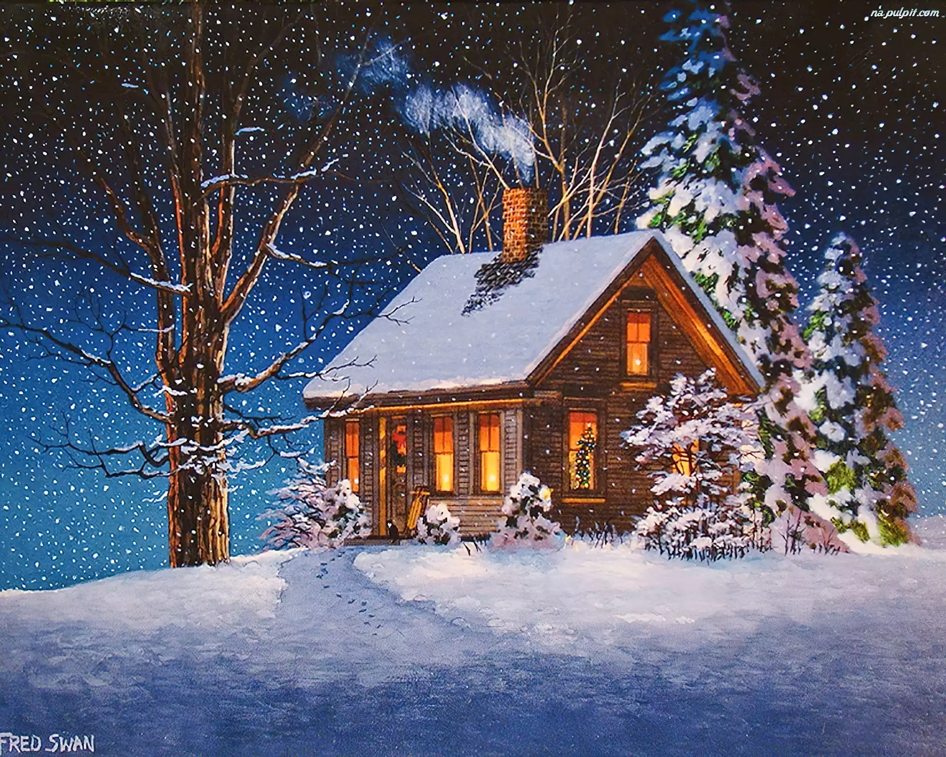Choinka, Narodzenie, Malarstwo, Zima, Dom, Boże Na Pulpit