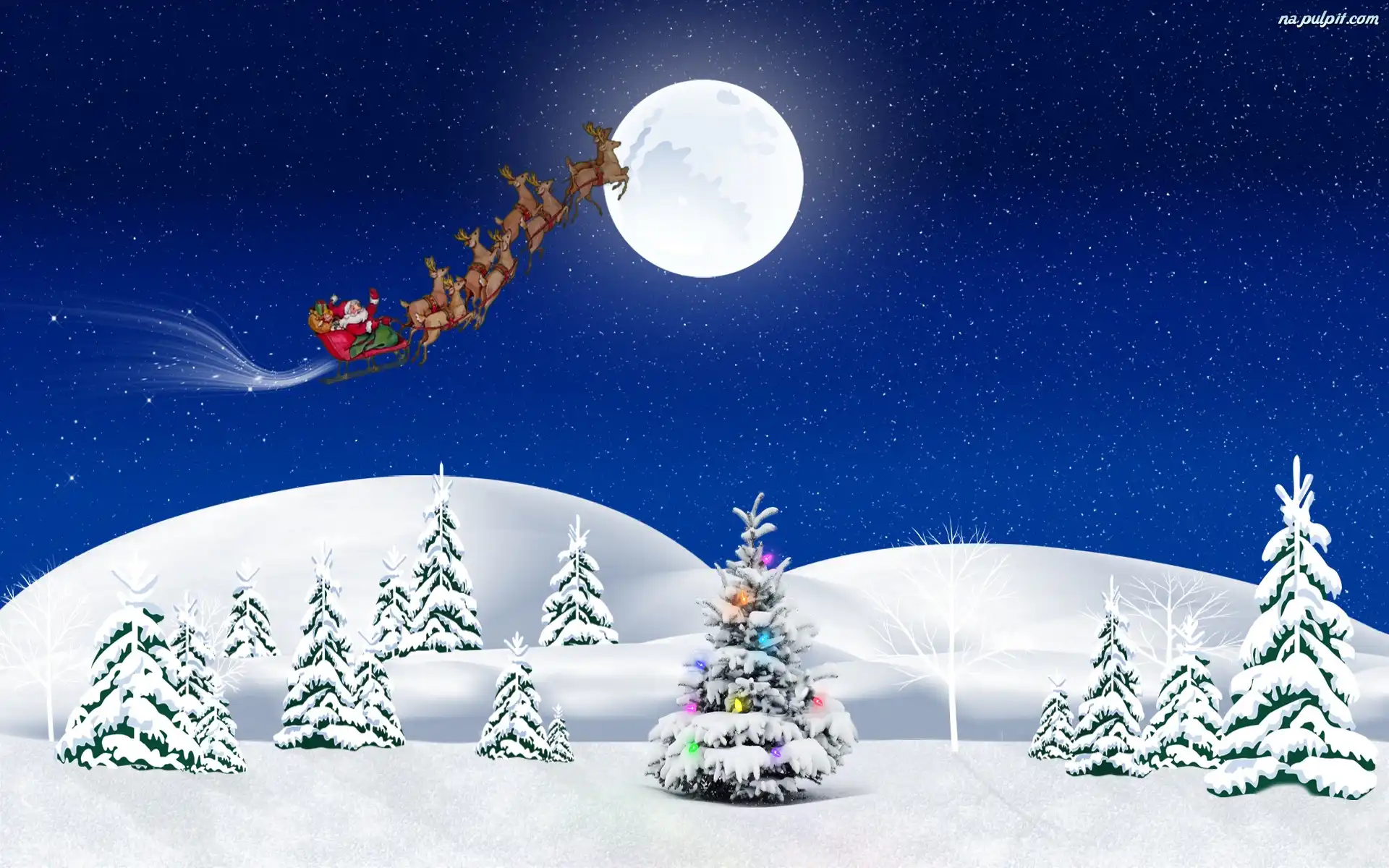 Zima, Choinka, Mikołaj, Boże, Narodzenie, Sanie, Góry, Księżyc Na Pulpit