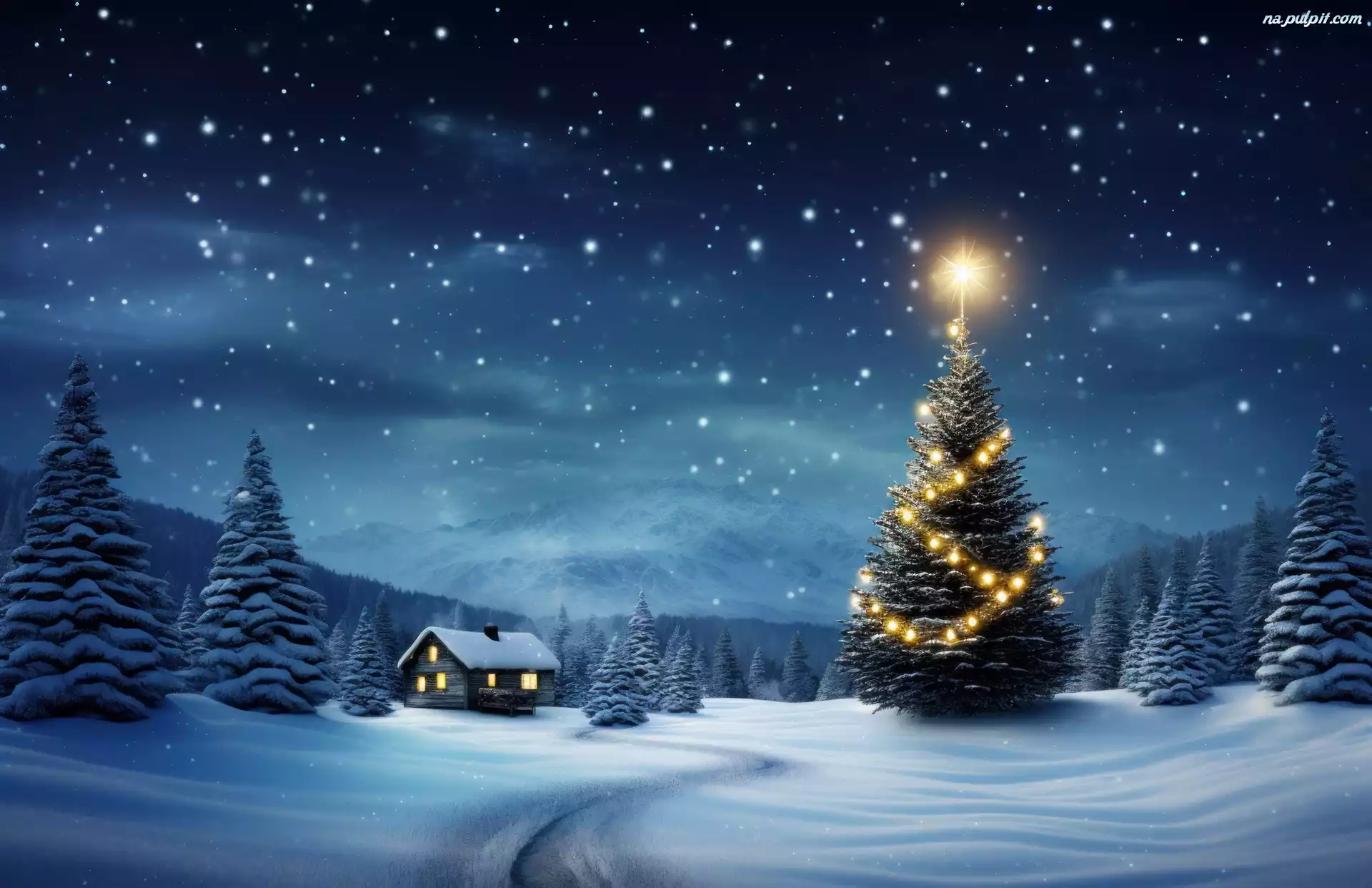 Noc, Boże Narodzenie, Choinka, Dom, Zima, Grafika Na Pulpit