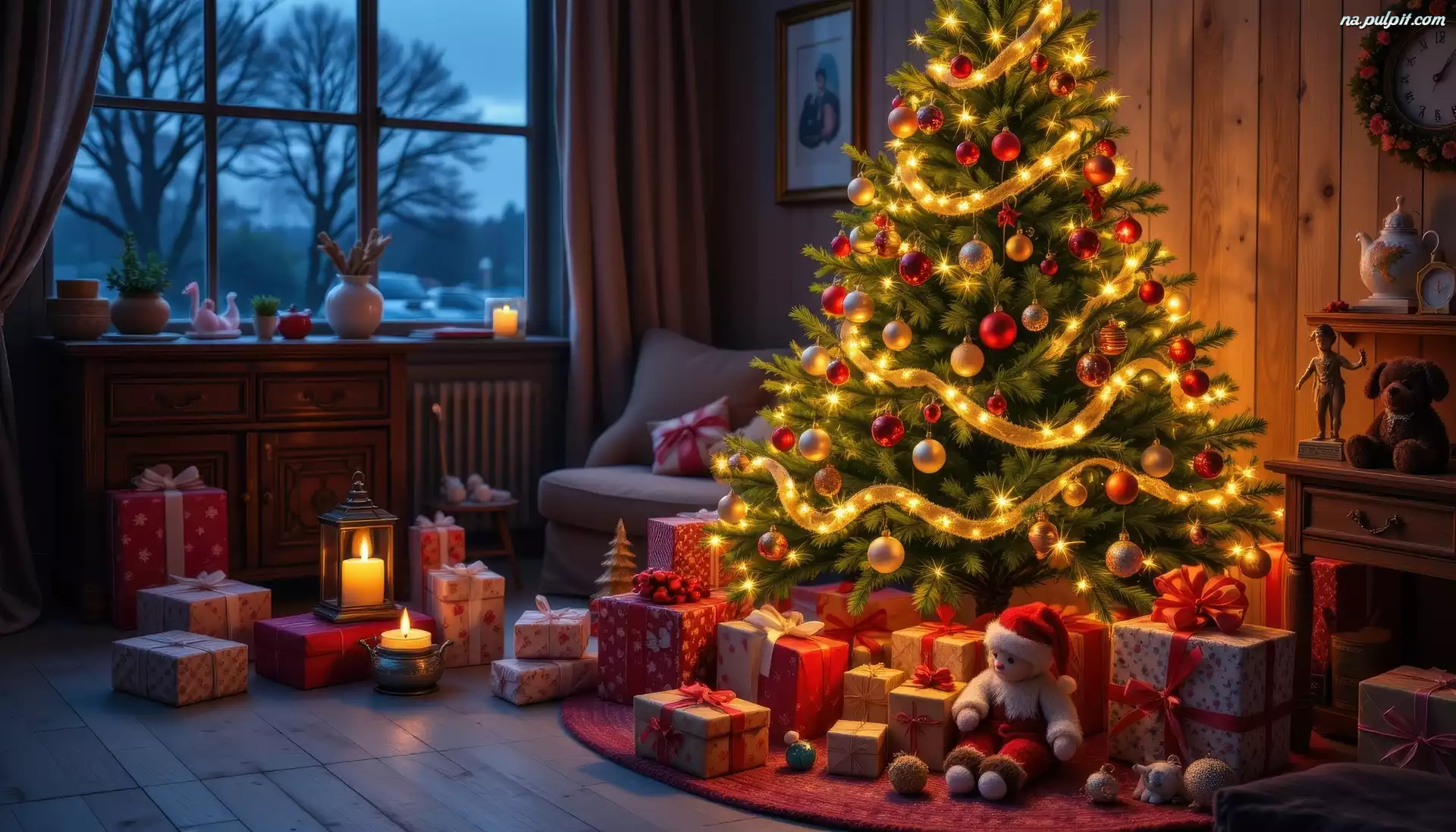 Prezenty, Boże Narodzenie, Choinka, Okno, Salon, Świece