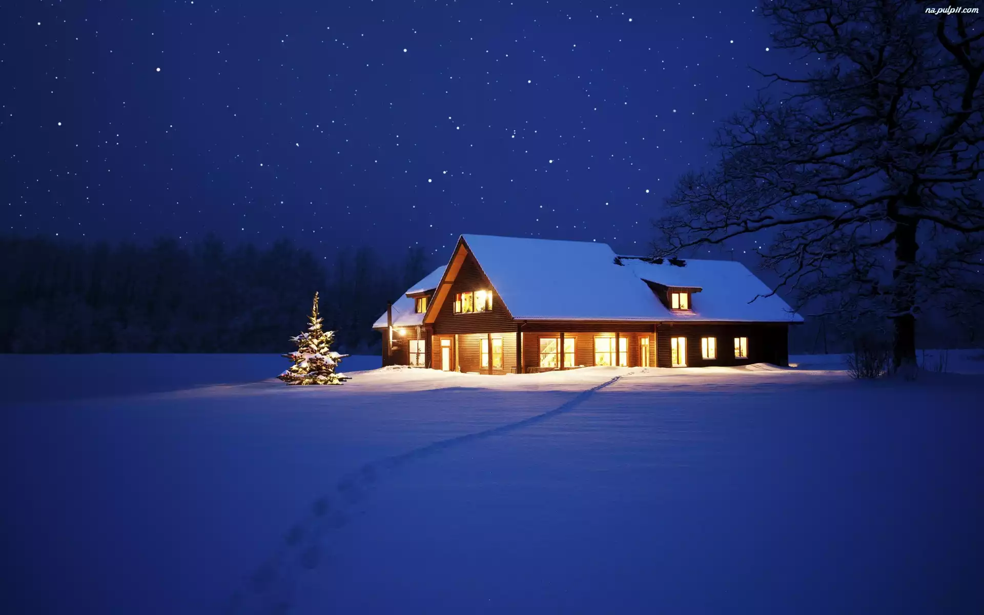 Choinka, Dom, Oświetlony, Zima Na Pulpit