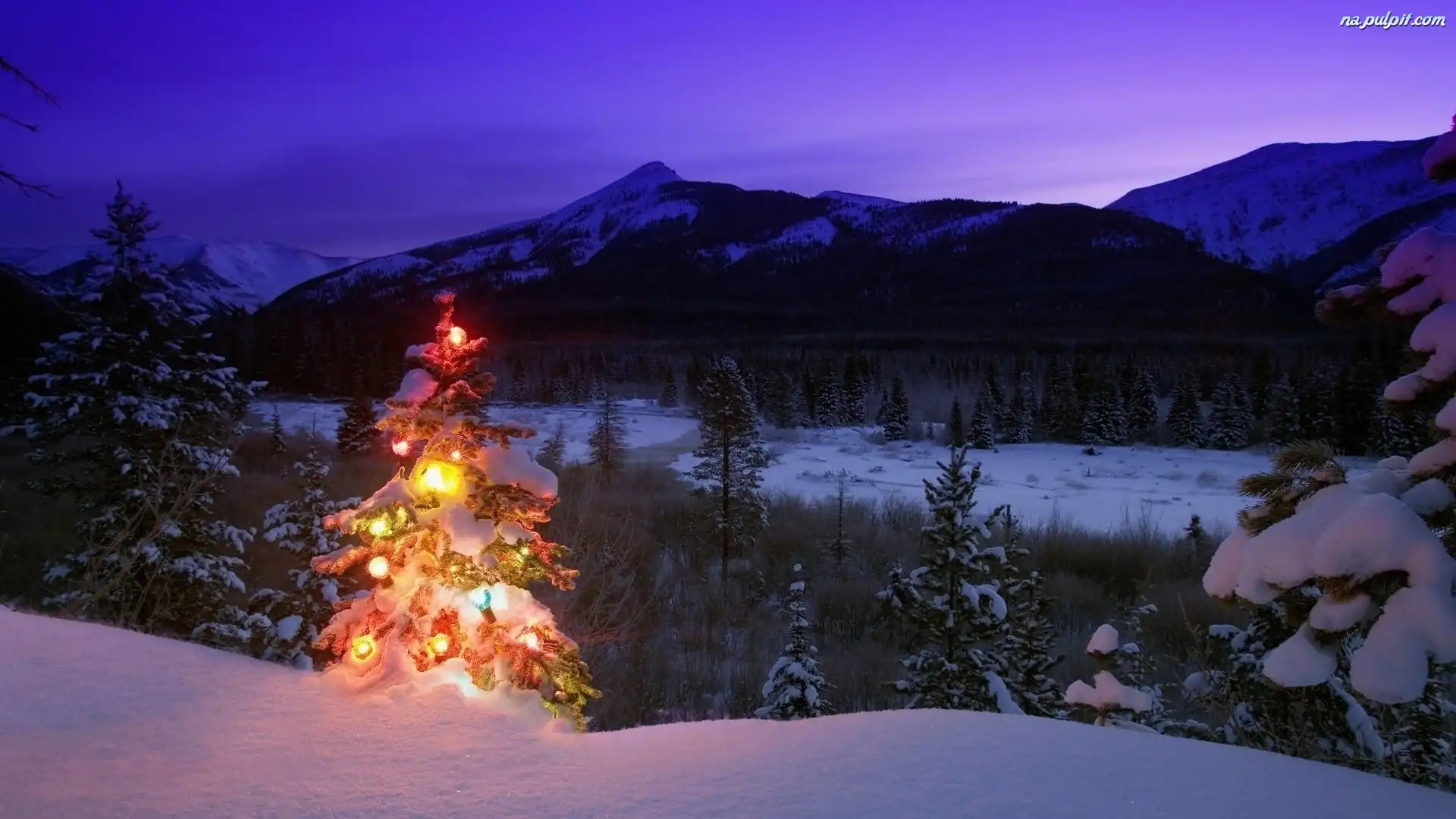 Choinka, Góry, Zima, Oświetlona Na Pulpit