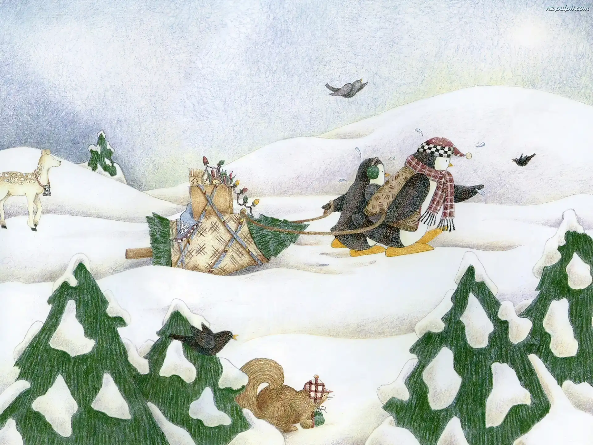 Choinka, Pingwiny, Åšnieg, Zima, Sanie Na Pulpit