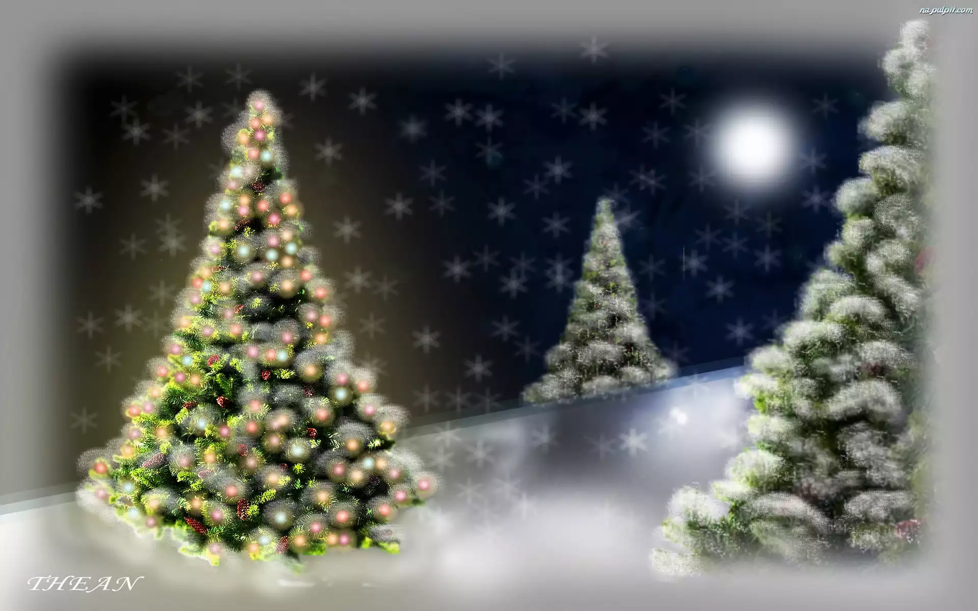 Śnieg, Śnieżynki, Choinki, Księżyc