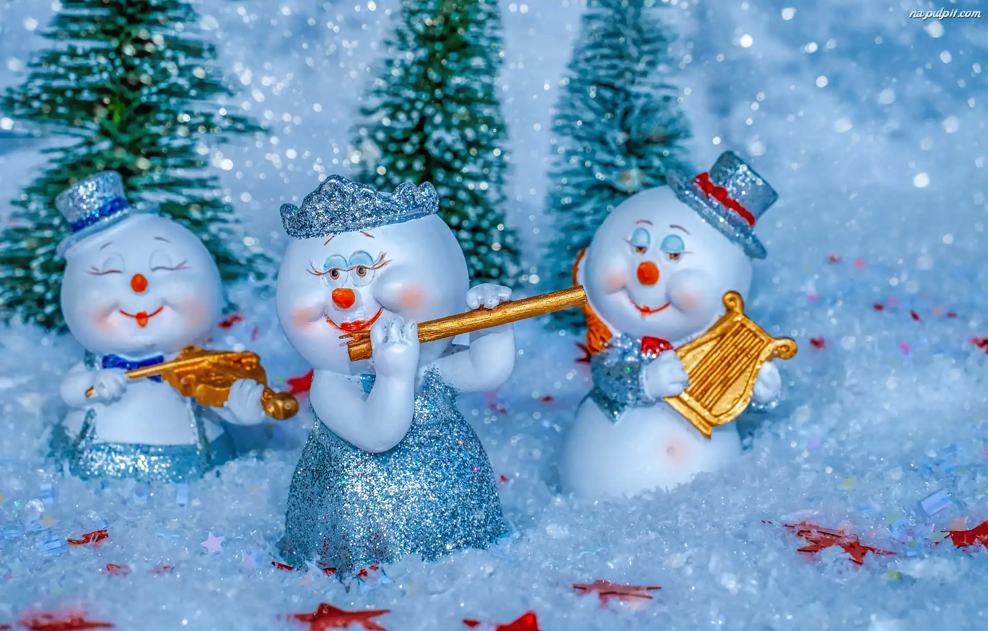 Śnieg, Trzy, Bałwanki, Gwiazdki, Świąteczne, Instrumenty, Figurki, Choinki
