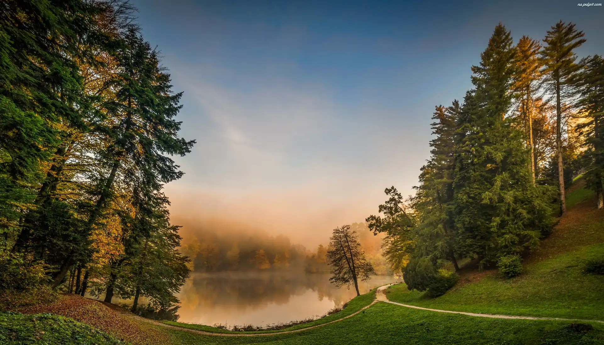 Chorwacja, Mgła, Las, Jezioro, Świt Na Pulpit