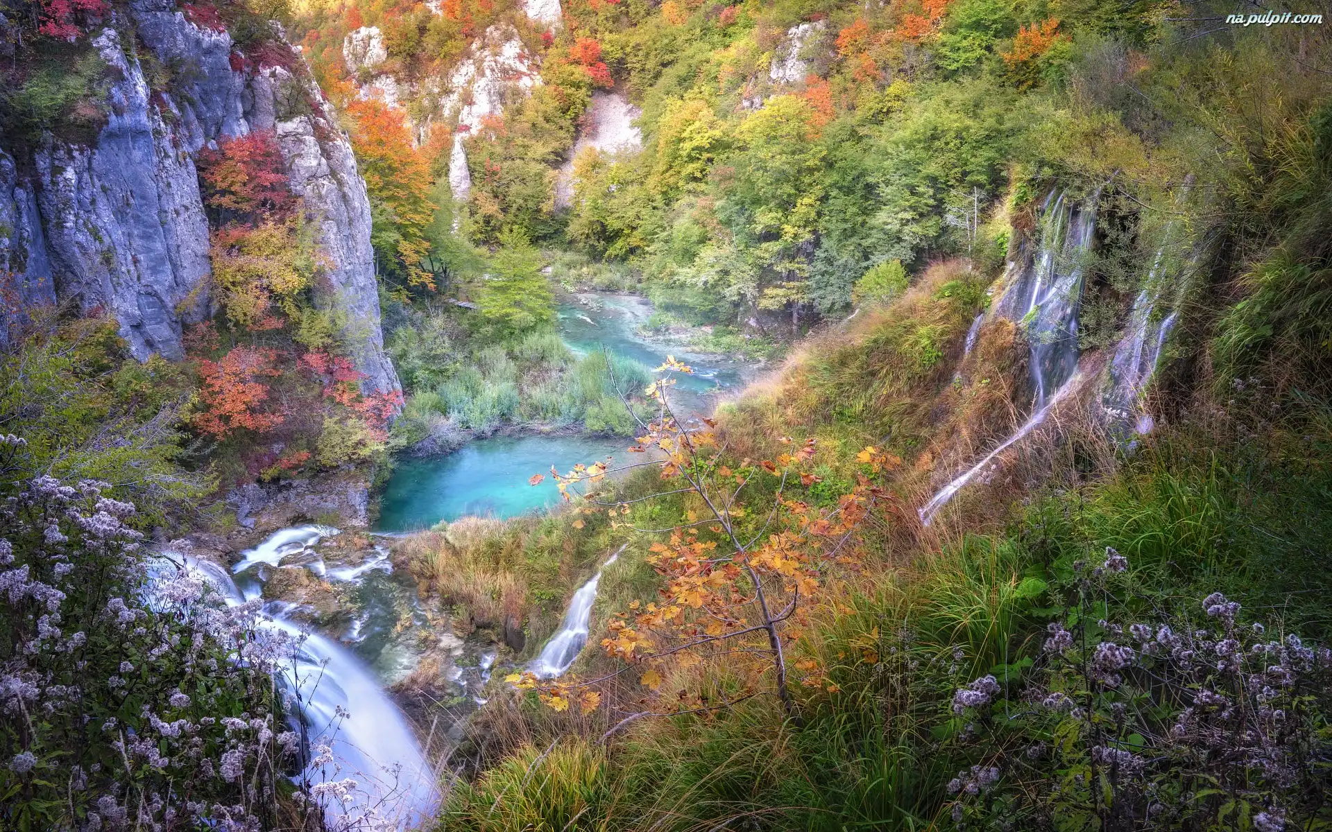 Chorwacja, Wodospad, Rzeka, Park Narodowy Jezior Plitwickich, Drzewa, Skały, Jesień Na Pulpit