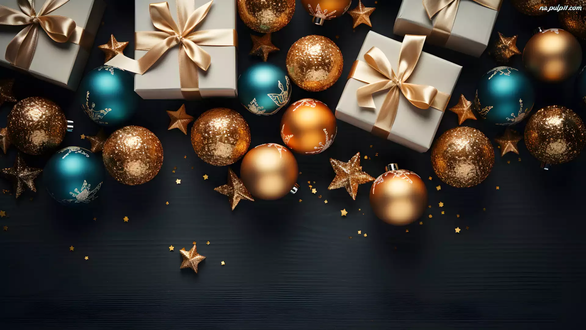 Ciemne, Tło, Boże Narodzenie, Kokardy, Kolorowe, Prezenty, Dekoracja, Gwiazdy, Bombki Na Pulpit