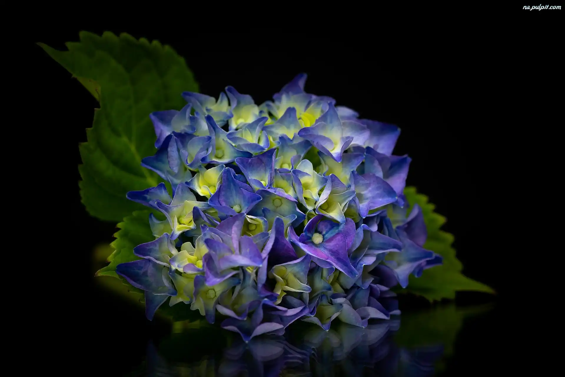Ciemne tło, Niebieska, Hortensja, Kwiat, Liście Na Pulpit