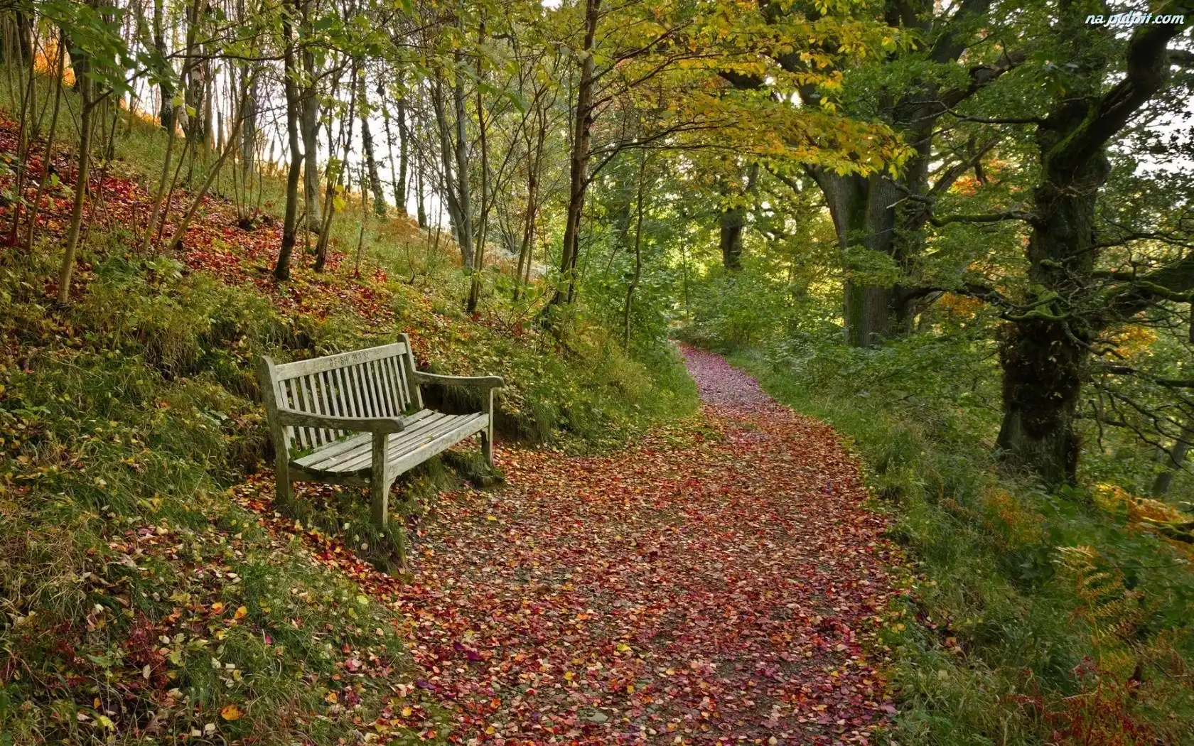 Ścieżka, Liście, Jesień, Ławka, Góra, Drzewa Na Pulpit