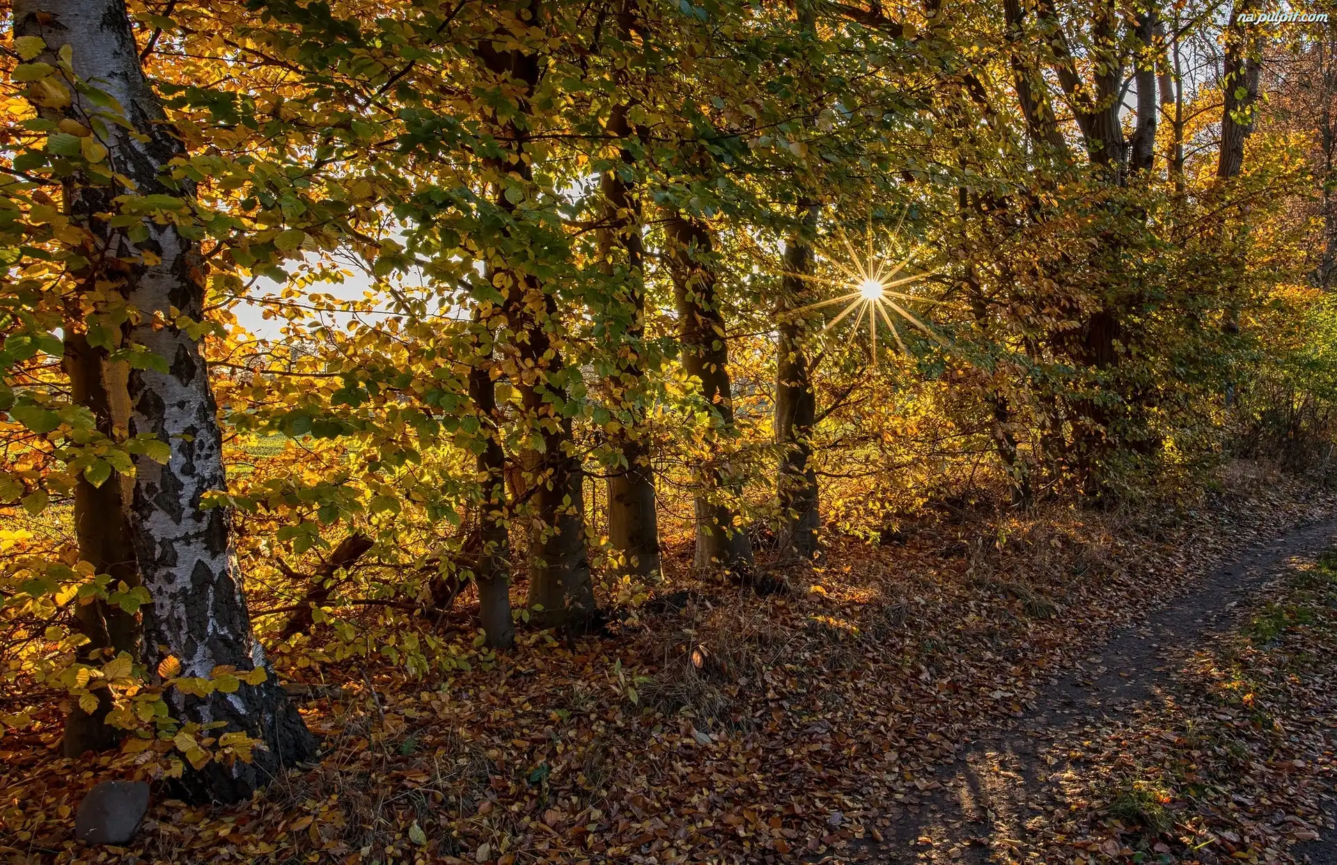 Brzozy, Ścieżka, Jesień, Liście, Drzewa, Promienie słońca Na Pulpit