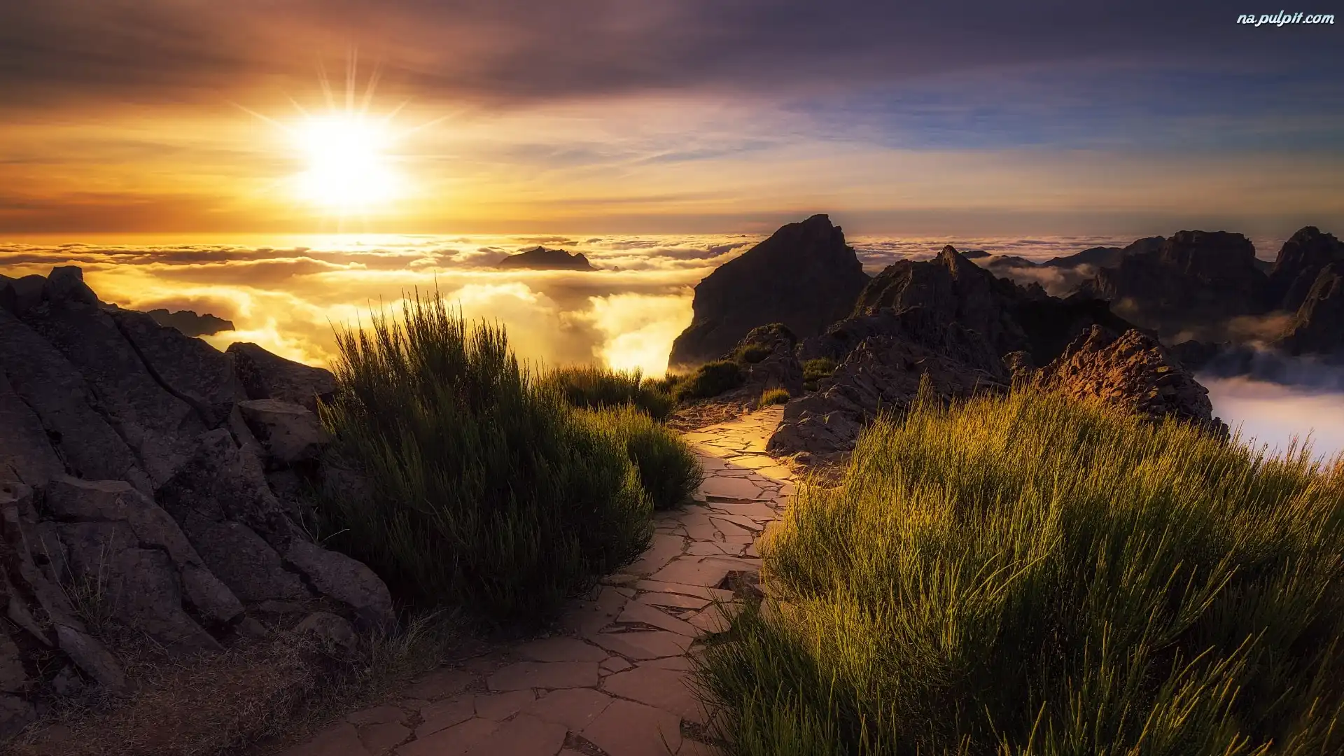 Skały, Ścieżka, Trawa, Mgła, Góry, Wschód słońca Na Pulpit