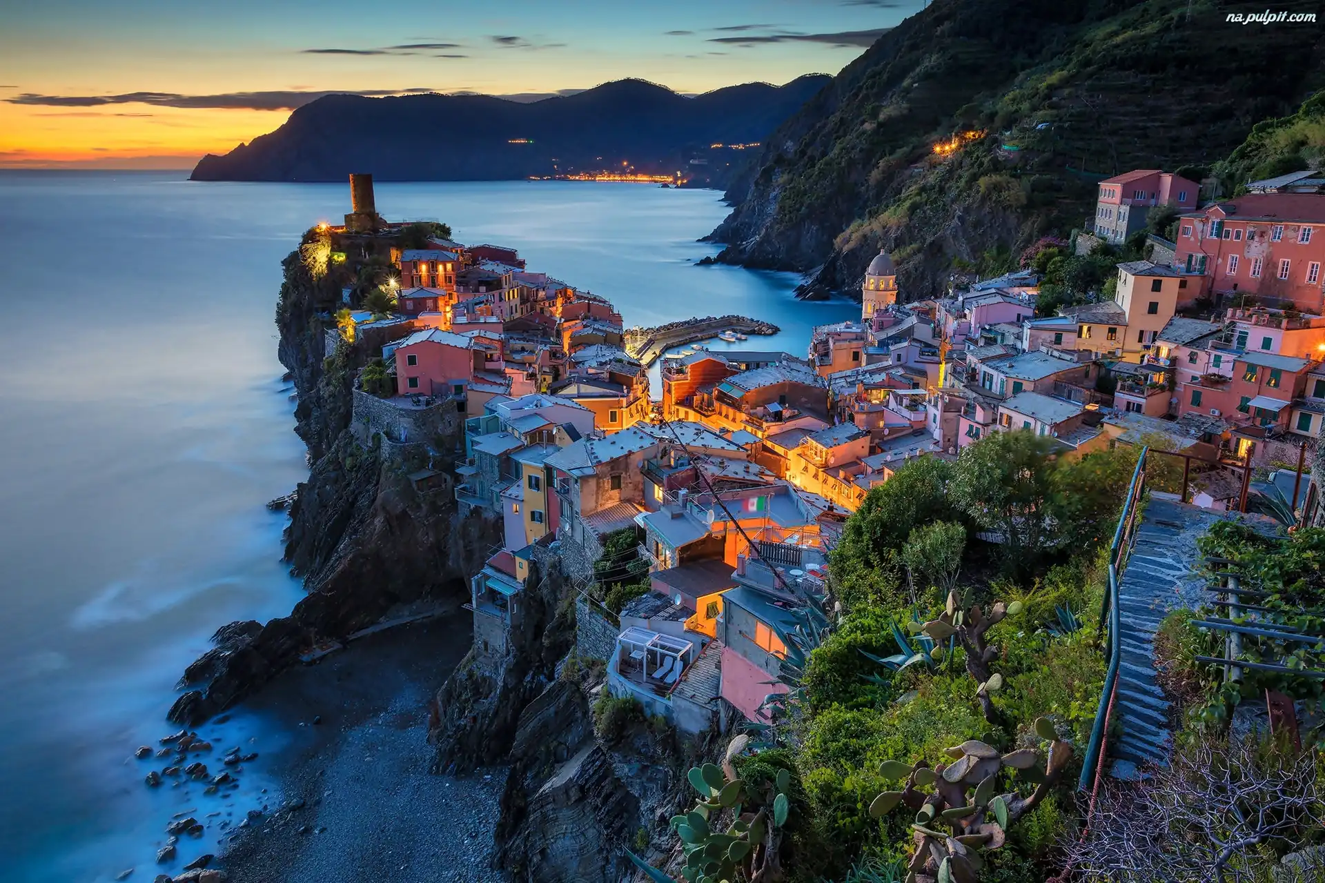 Noc, Cinque Terre, Morze, Domy, Vernazza, Włochy, Góry Na Pulpit