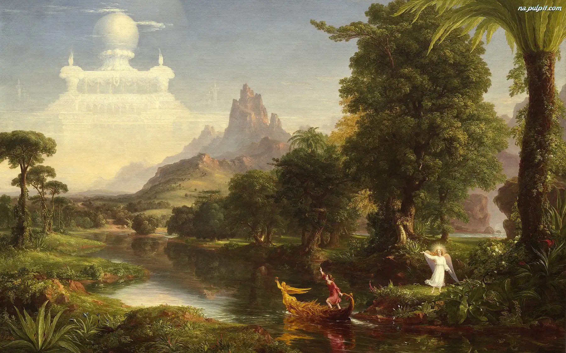 Zamek, Thomas Cole, Obraz, Łódka, Anioł, Podróż życia młodość, Malarstwo, Rzeka Na Pulpit