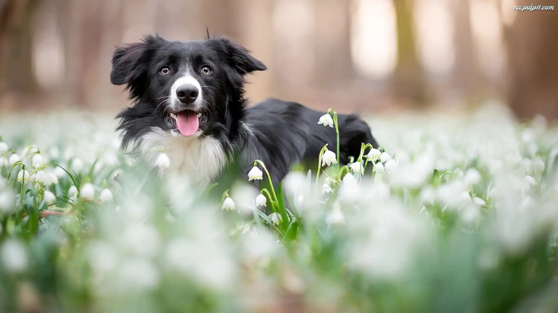 Border collie, Kwiaty, Śnieżyce, Mordka, Pies, Łąka Na Pulpit