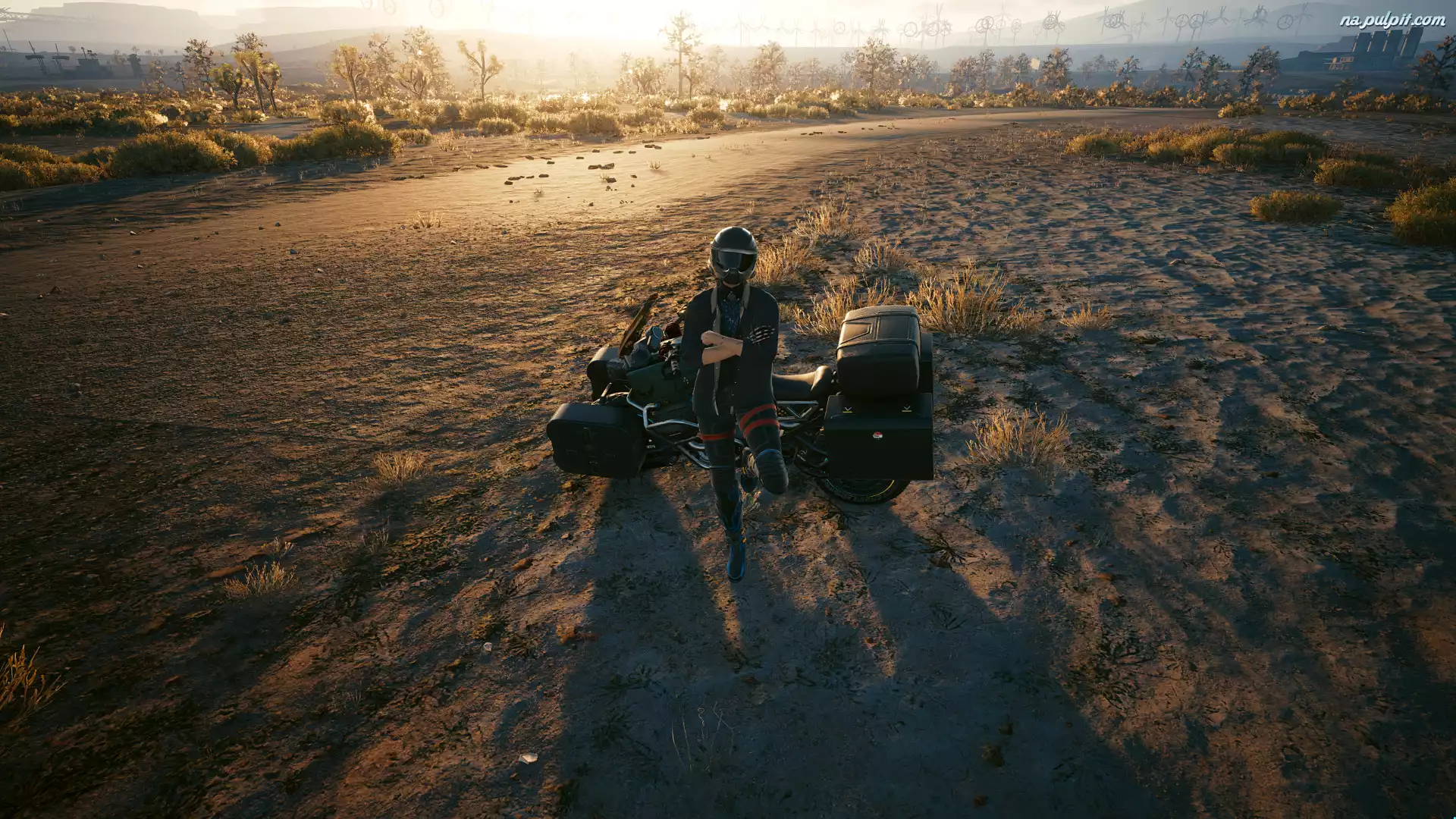 Gra, Pole, Postać, Cyberpunk 2077, Motocykl