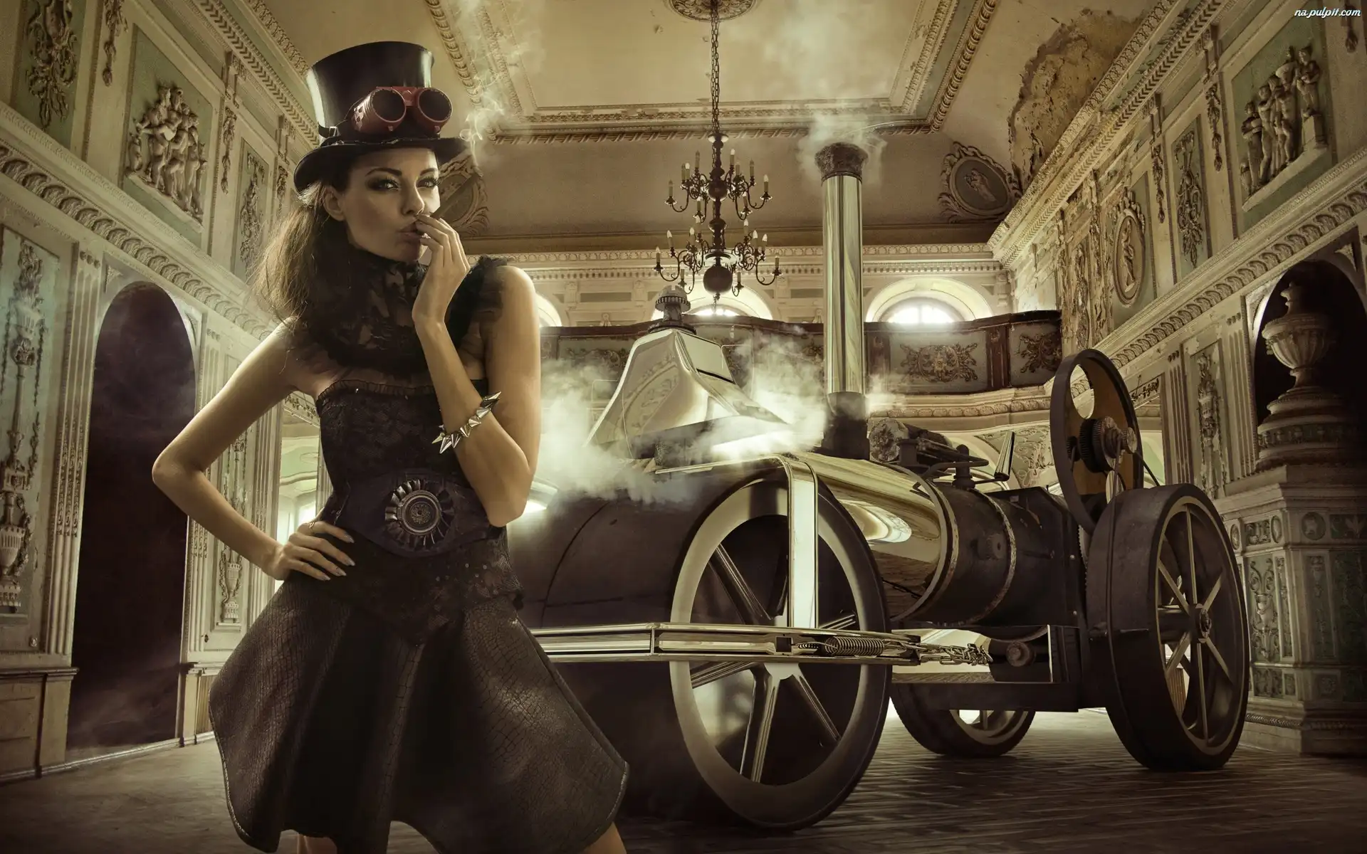 Modelka, Cygaro, Auto Parowe, Sukienka, Kobieta, Cylinder Na Pulpit