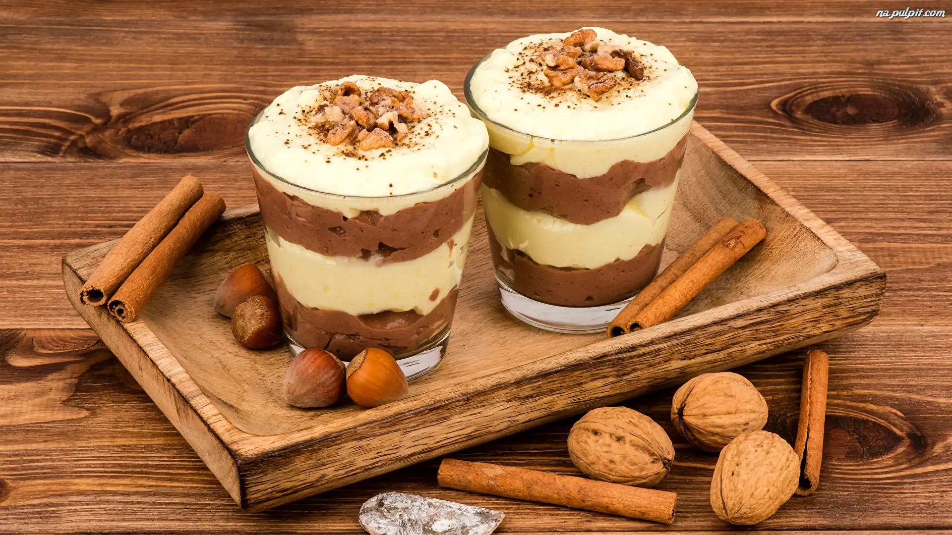 Szklanki, Waniliowe, Orzechy włoskie, Taca, Deski, Laskowe, Desery, Laski cynamonu Na Pulpit