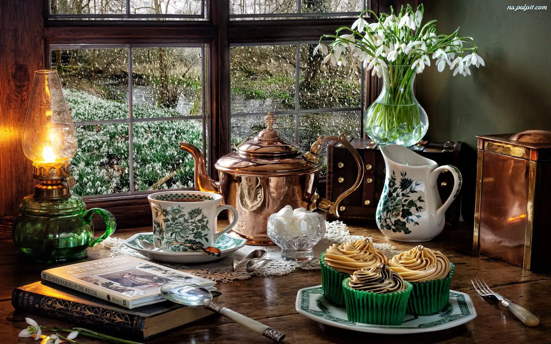 Okno, Dzbanek, Kwiaty, Lampa, Babeczki, Filiżanka, Książki, Przebiśniegi, Kompozycja, Czajnik Na Pulpit |