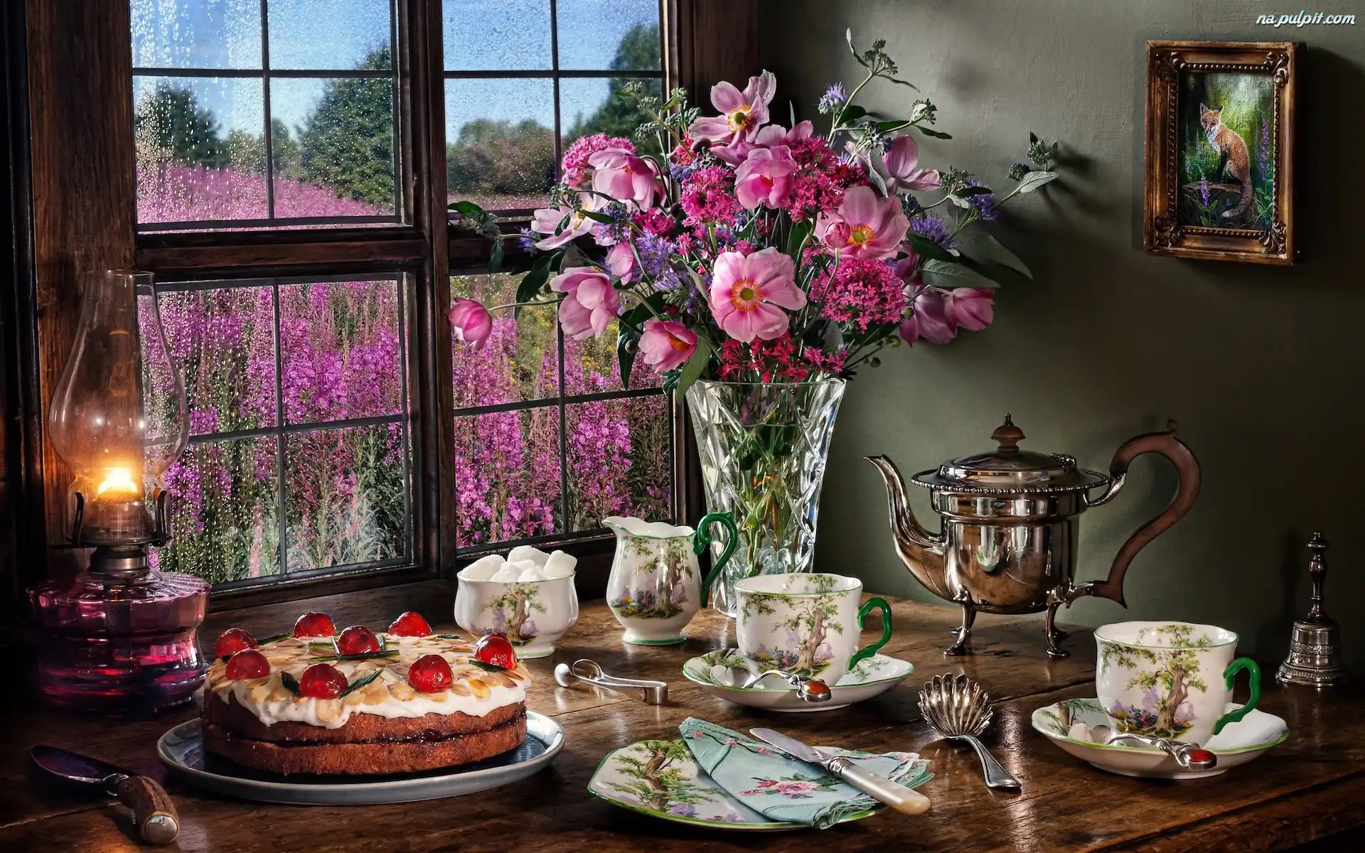 Czajnik, Tort, Lampa, Kompozycja, Okno, Bukiet kwiatów, Serwis kawowy