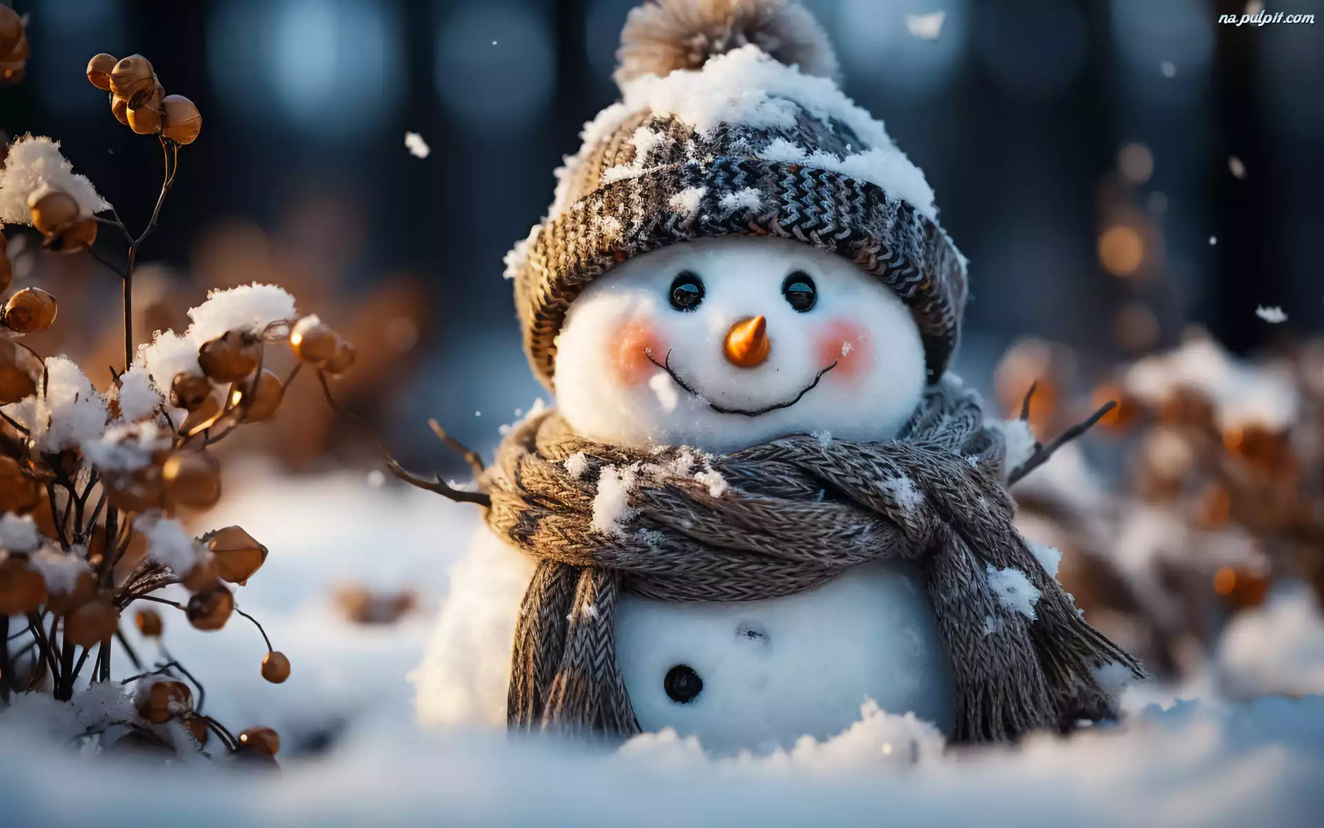 Szalik, Bałwan, Uśmiech, Zima, Rośliny, Suche, Śnieg, Czapka Na Pulpit
