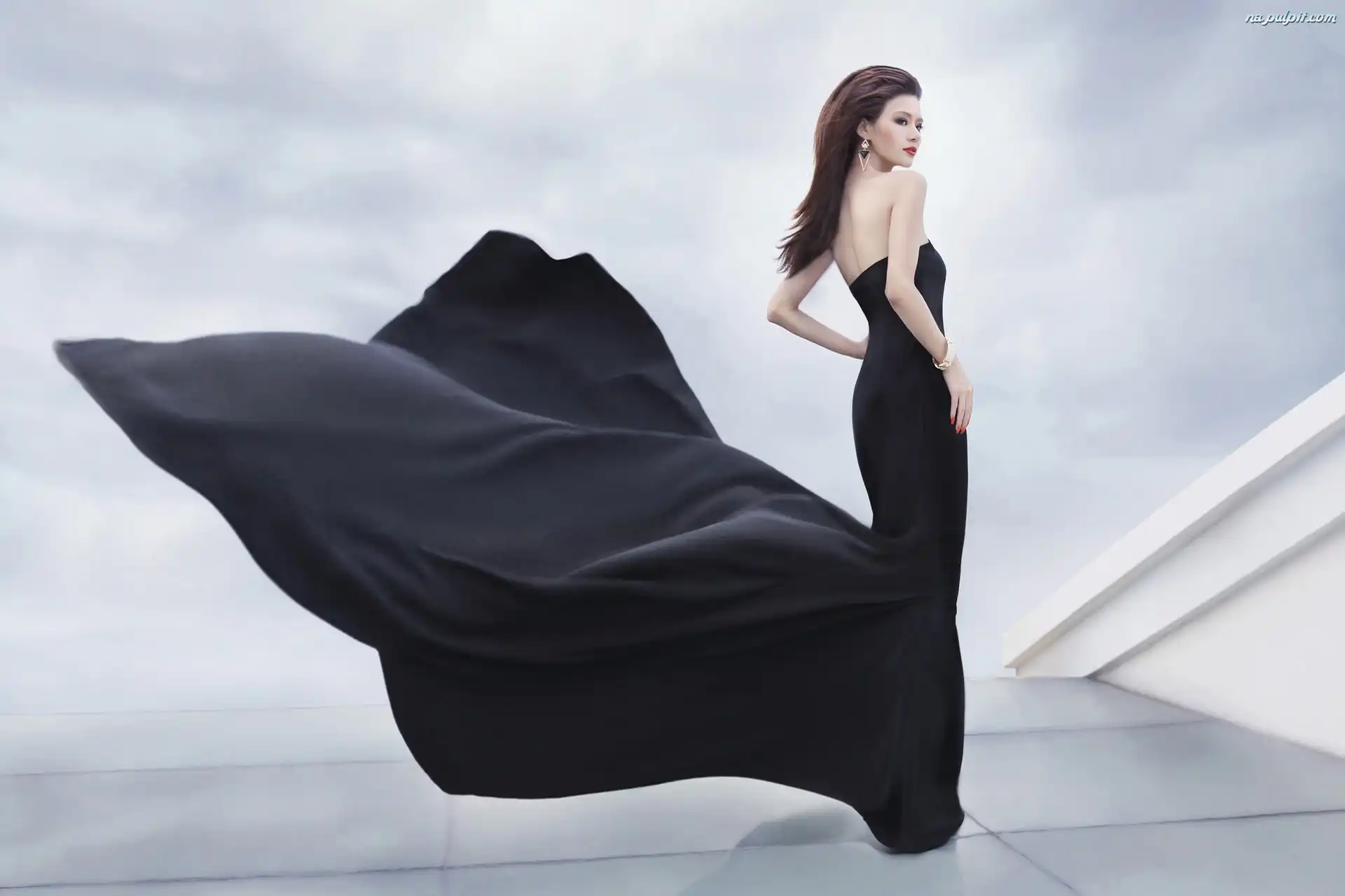 Modelka, Czarna Sukienka, Wiatr, Brunetka, Kobieta, Biżuteria Na Pulpit