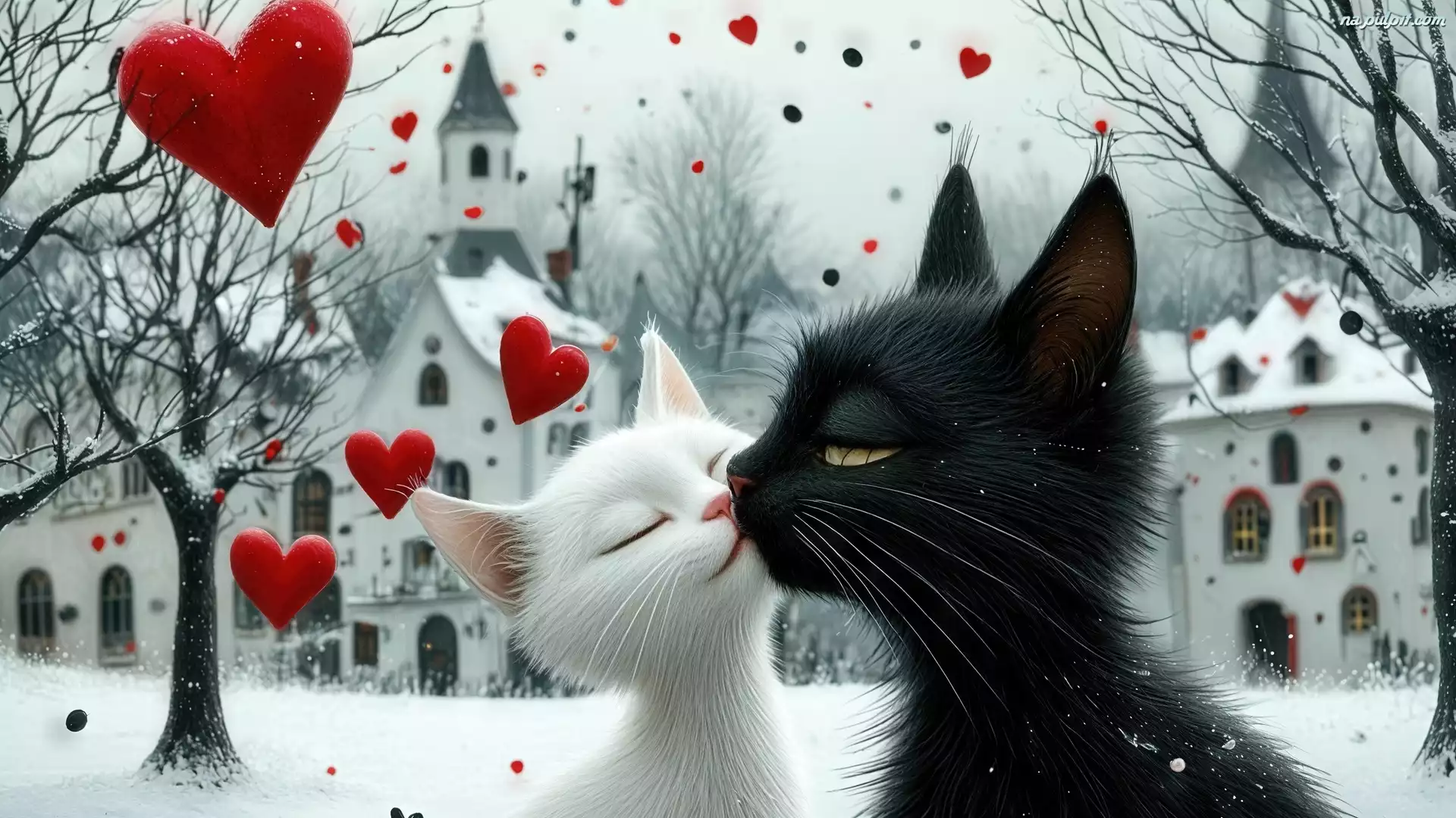 Serca, Dwa, Biały, Czarny, Koty, Grafika Na Pulpit