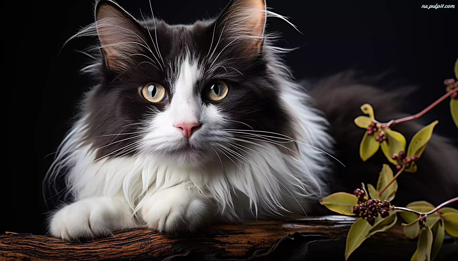 Pyszczek, Puszysty, Biało-czarny, Gałązka, Kot Na Pulpit