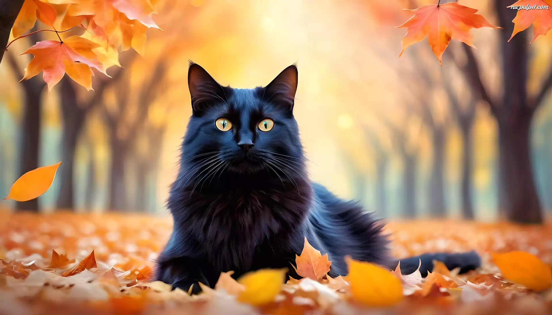 Liście, Czarny, Kot, Grafika, Jesienne Na Pulpit