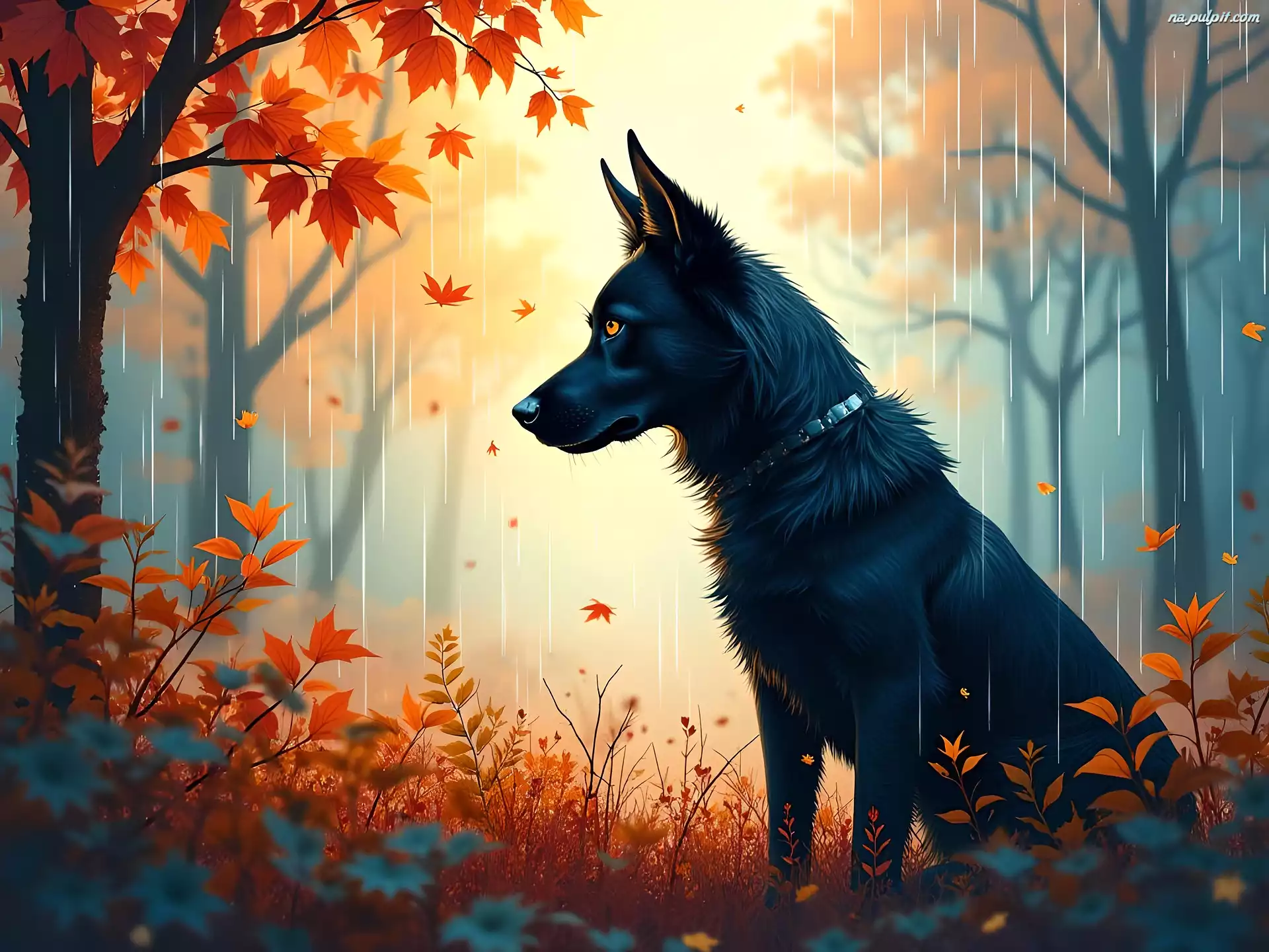 Grafika, Drzewa, Las, Czarny, Pies, Jesień, Deszcz Na Pulpit