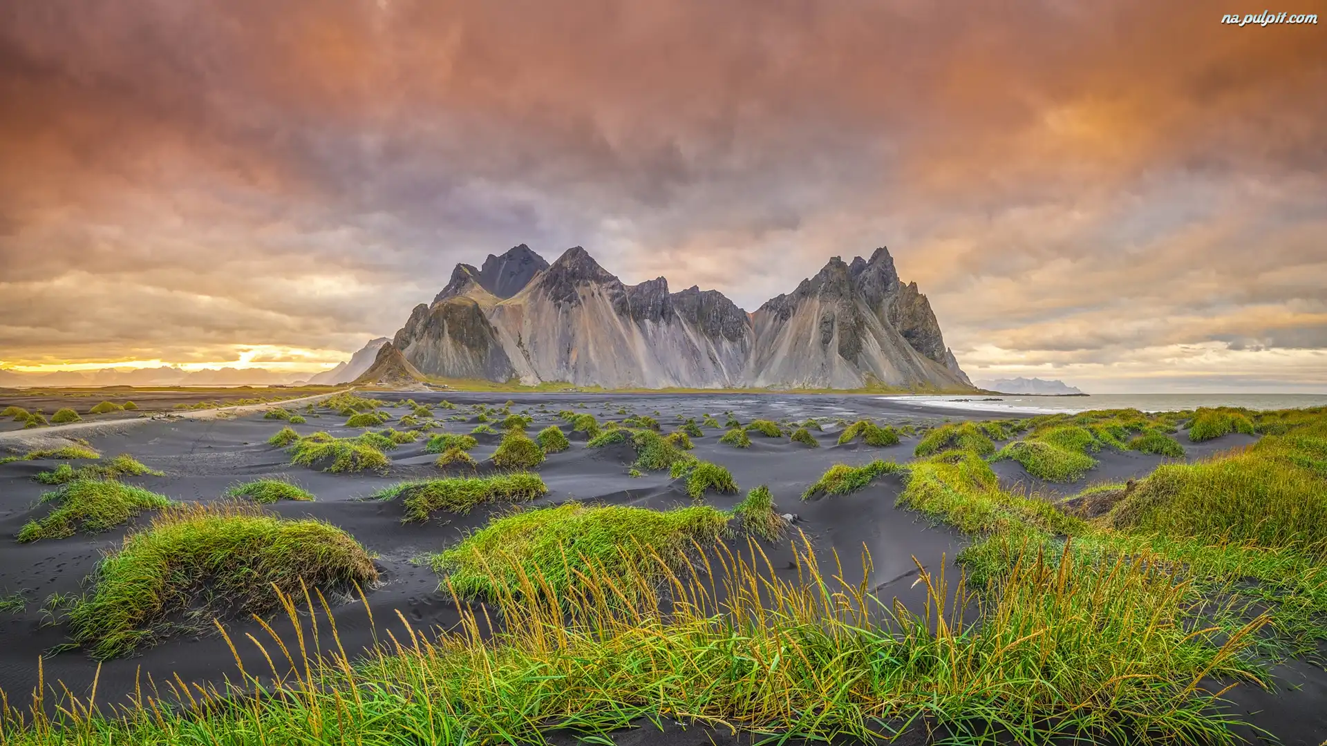 Czarny, Góra Vestrahorn, Piasek, Islandia, Niebo, Trawa, Góry, Plaża Na Pulpit