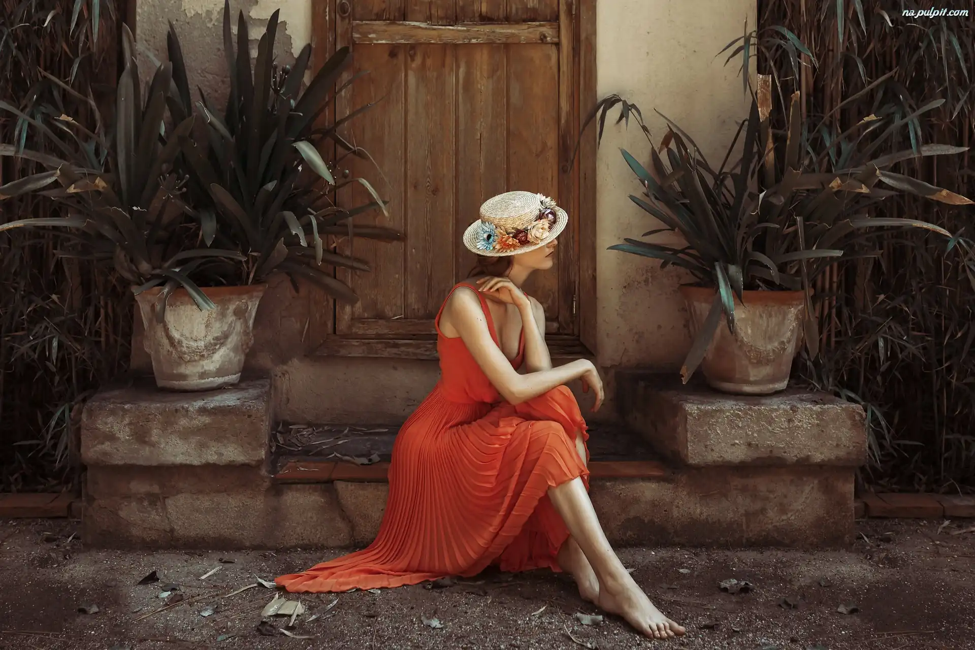 Czerwona, Schody, Dom, Sukienka, Kobieta, Kapelusz