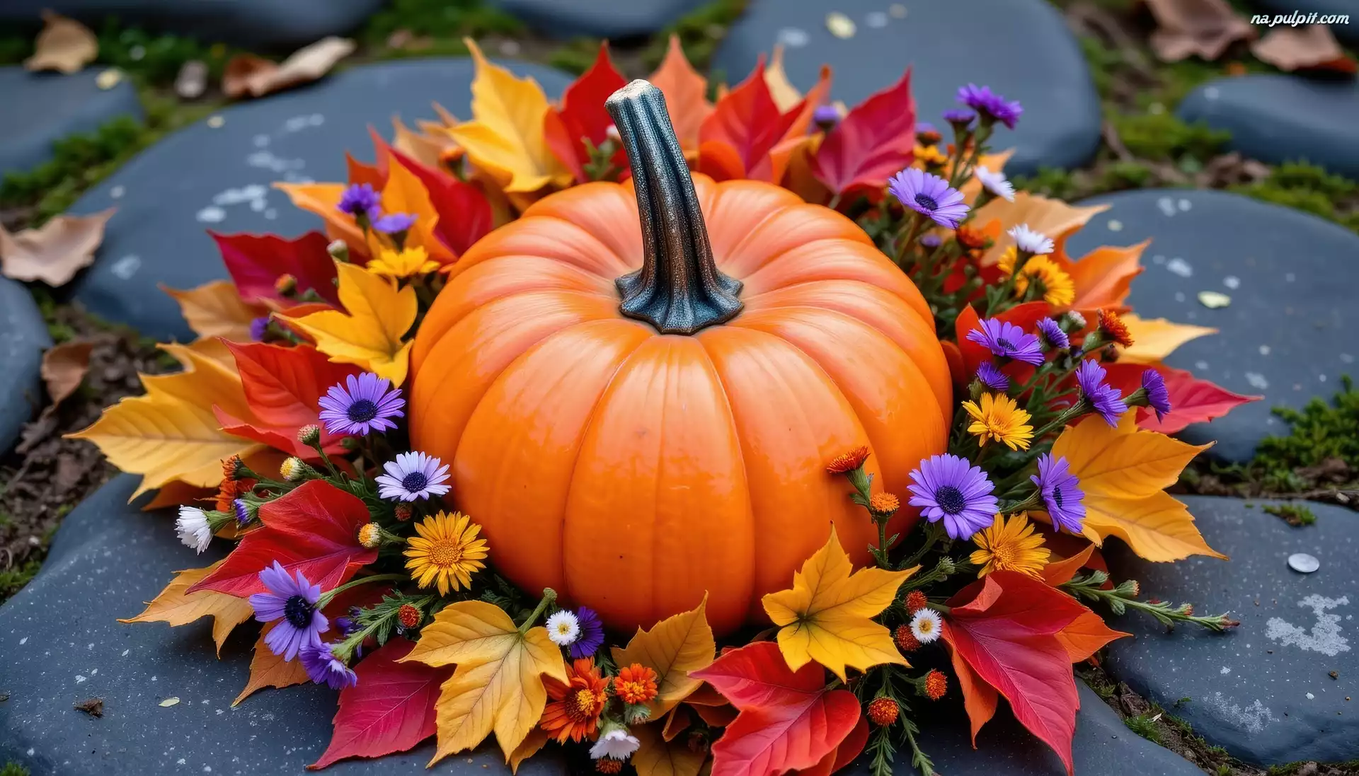 Kwiaty, Dynia, Żółte, Czerwone, Liście, AI Na Pulpit