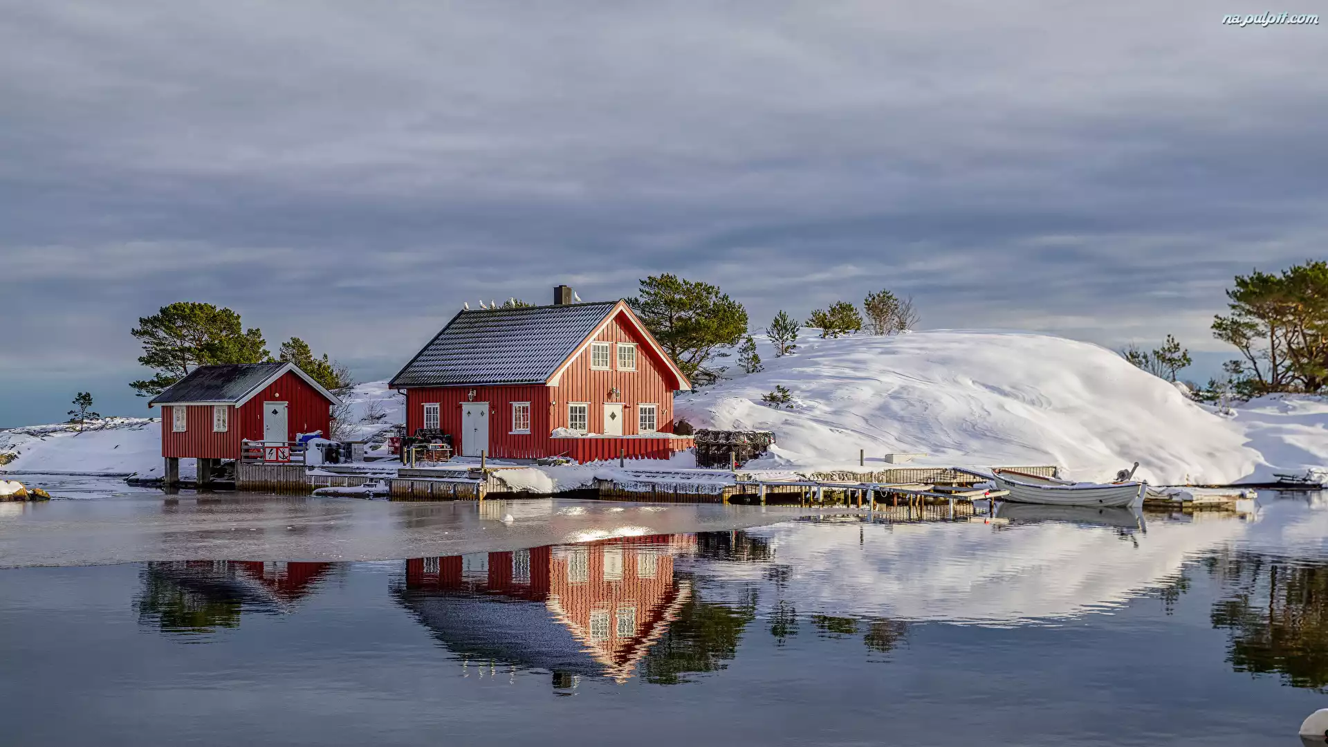 Arendal, Jezioro, Norwegia, Domy, Śnieg, Niebo, Czerwone, Odbicie, Zaspa, Skarestrand Na Pulpit