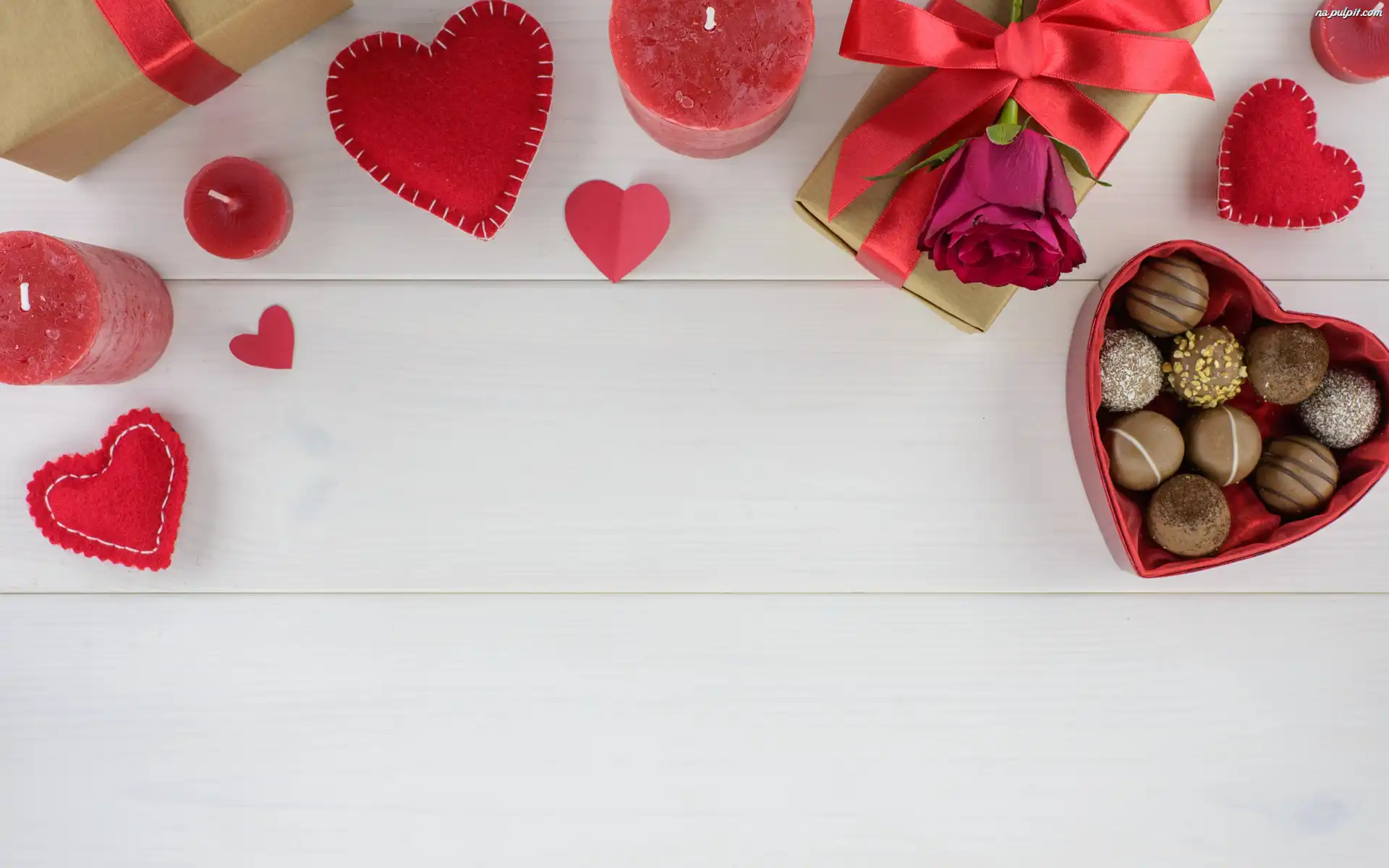 Świeczki, Róża, Czekoladki, Pralinki, Deski, Walentynki, Serca, Prezenty, Czerwone