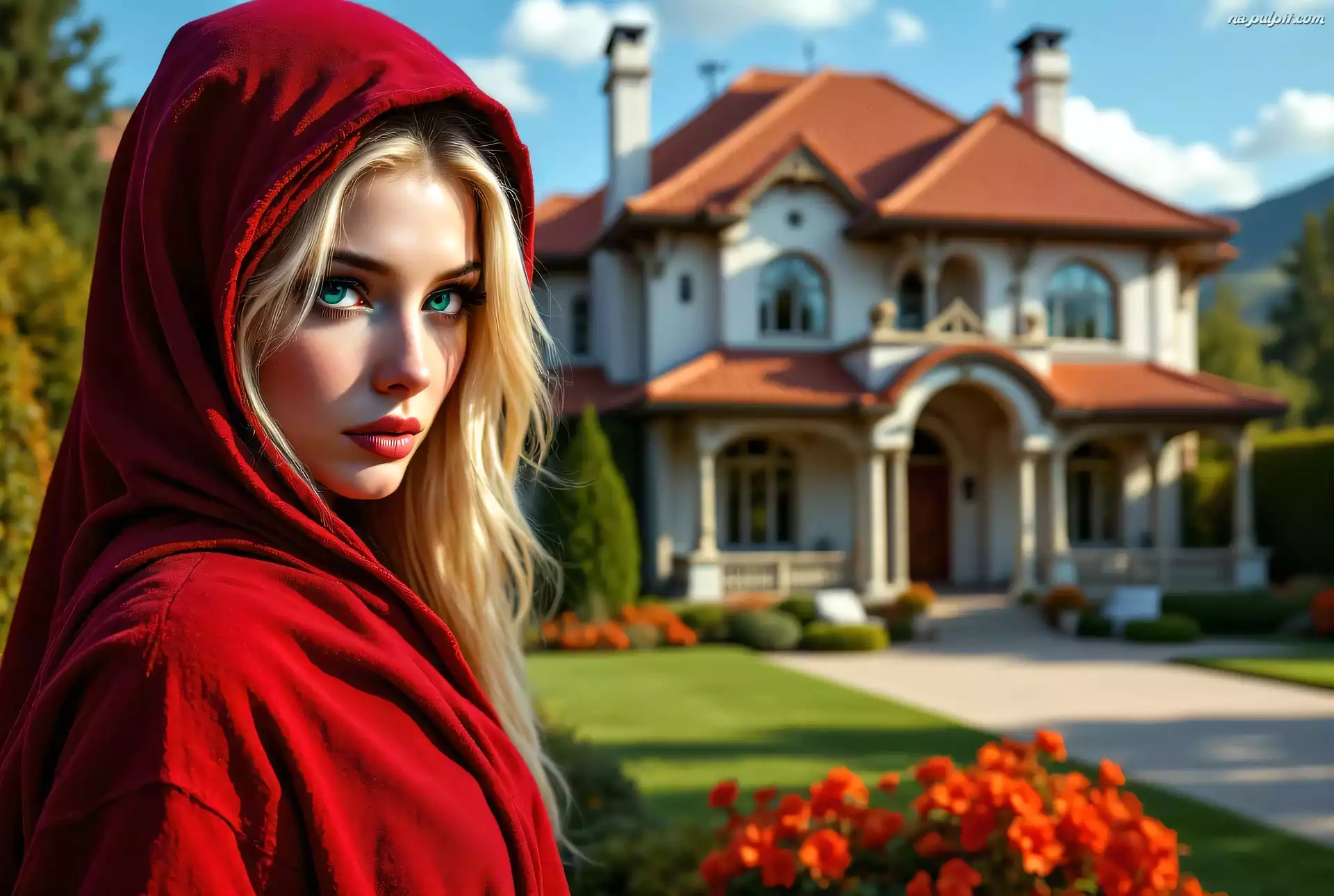 Kaptur, Oczy, Bluza, Kobieta, Grafika, Dom, Zielone, Czerwony Na Pulpit