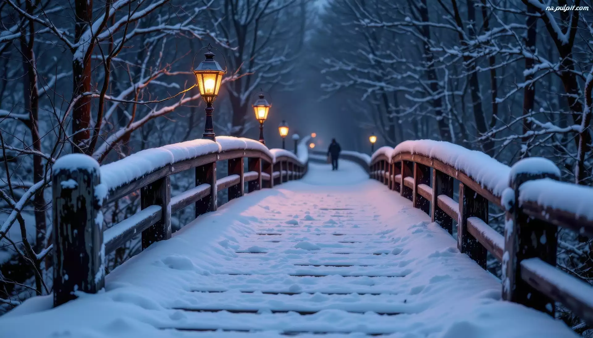 Park, Zima, Latarnie, Człowiek, Most, Drzewa Na Pulpit