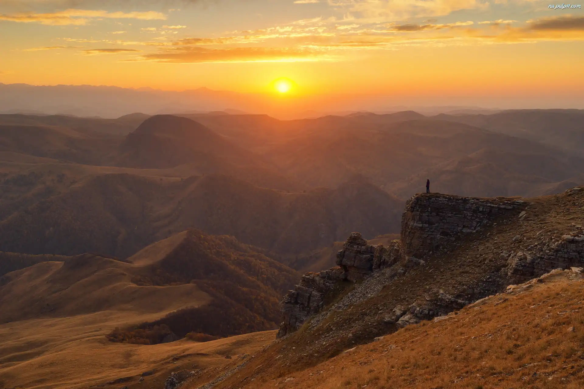 Człowiek, Wschód słońca, Góry, Skały Na Pulpit