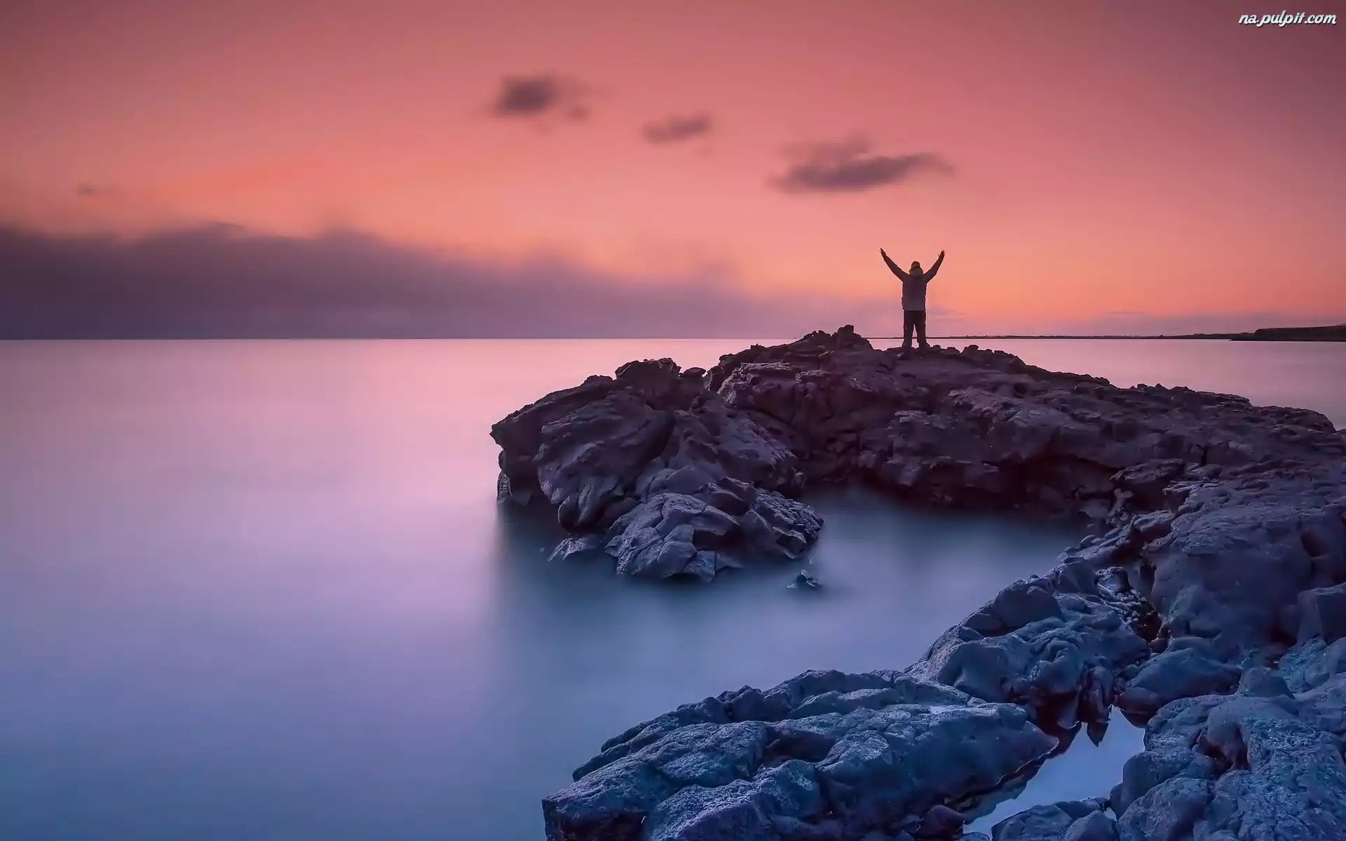 Człowiek, Skały, Morze, Zachód Słońca Na Pulpit