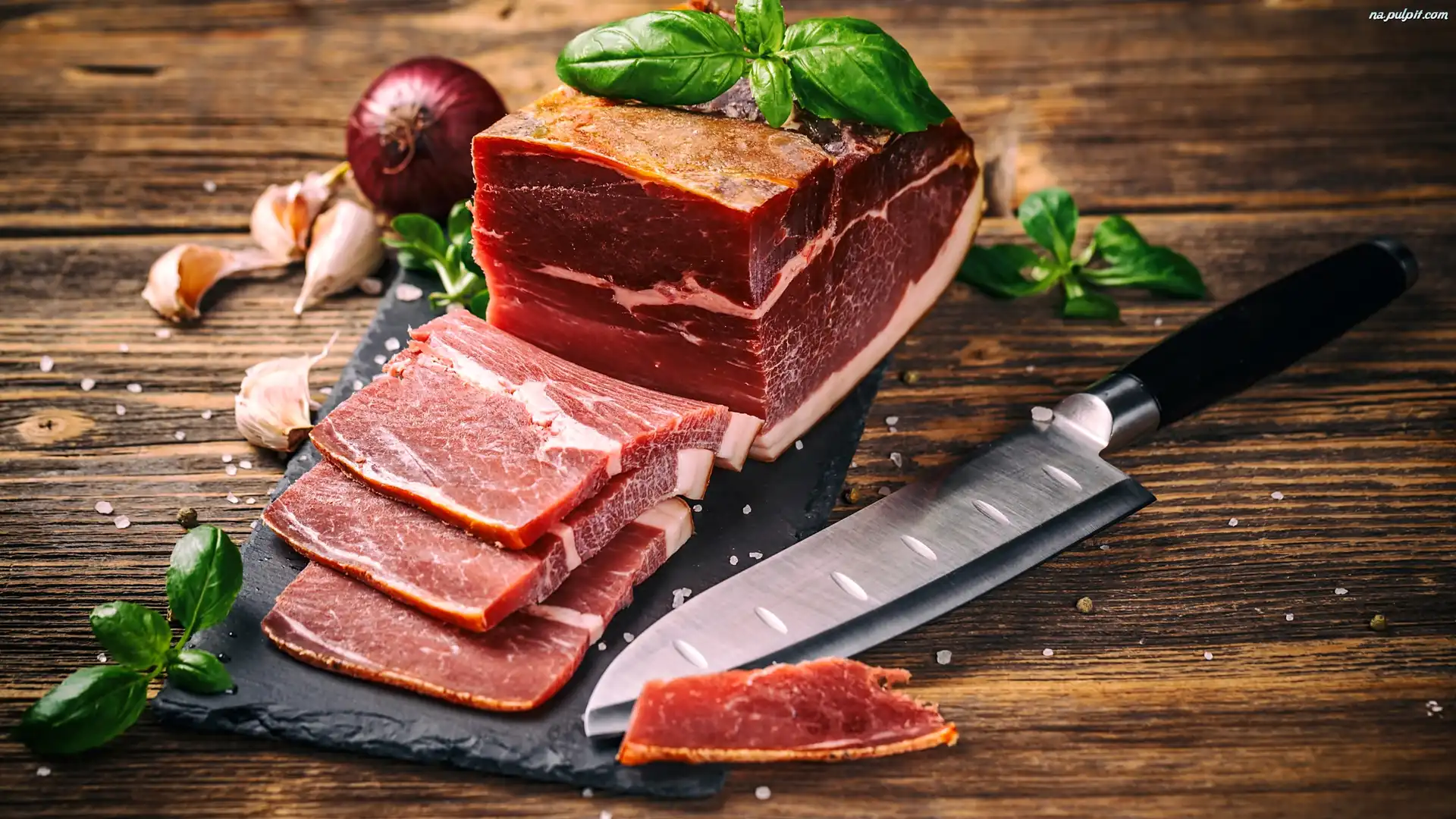 Deski, Czosnek, Nóż, Bazylia, Cebula, Szynka, Listki Na Pulpit