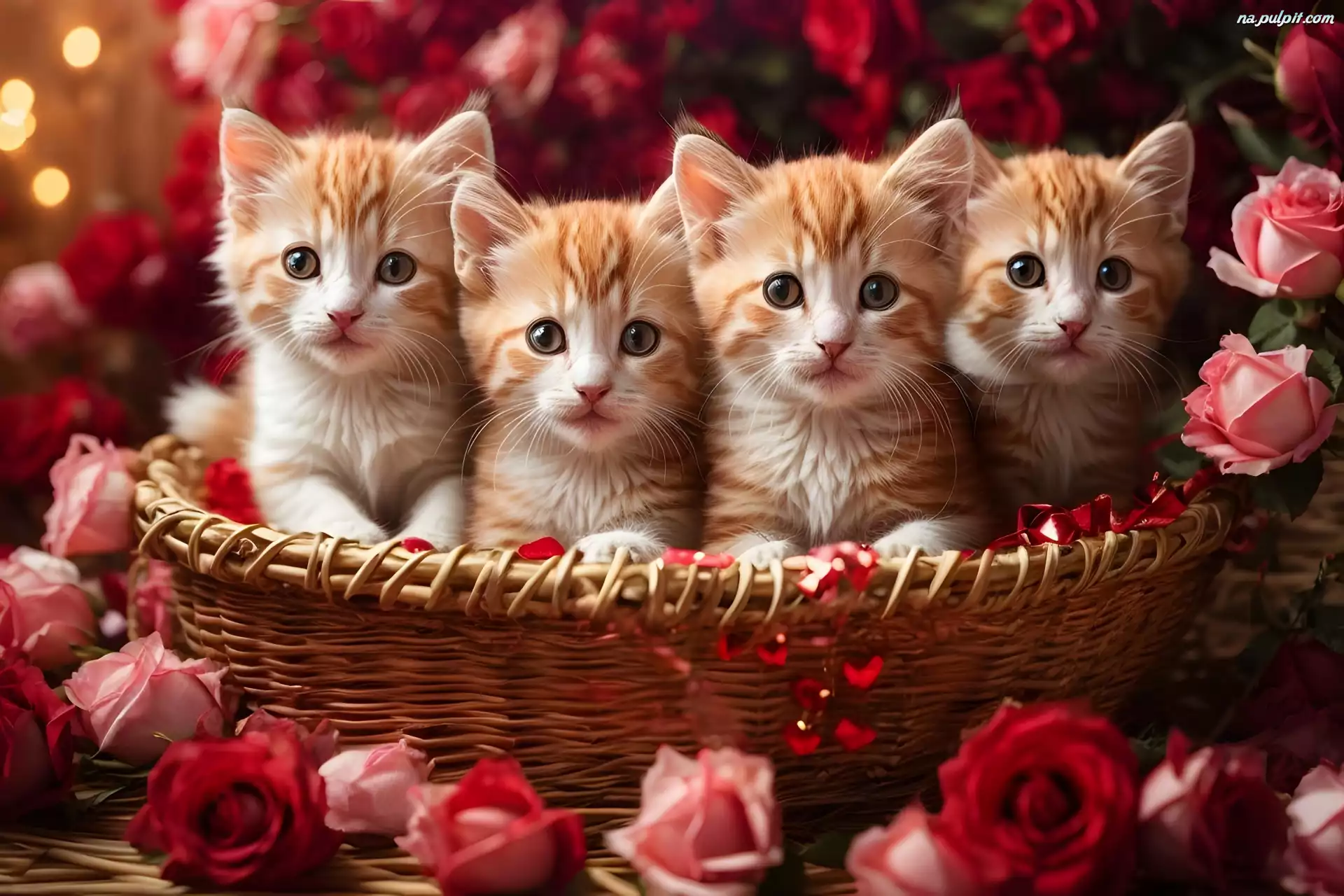 Grafika, Kwiaty, Koszyk, Cztery, Kocięta, Koty, Róże Na Pulpit