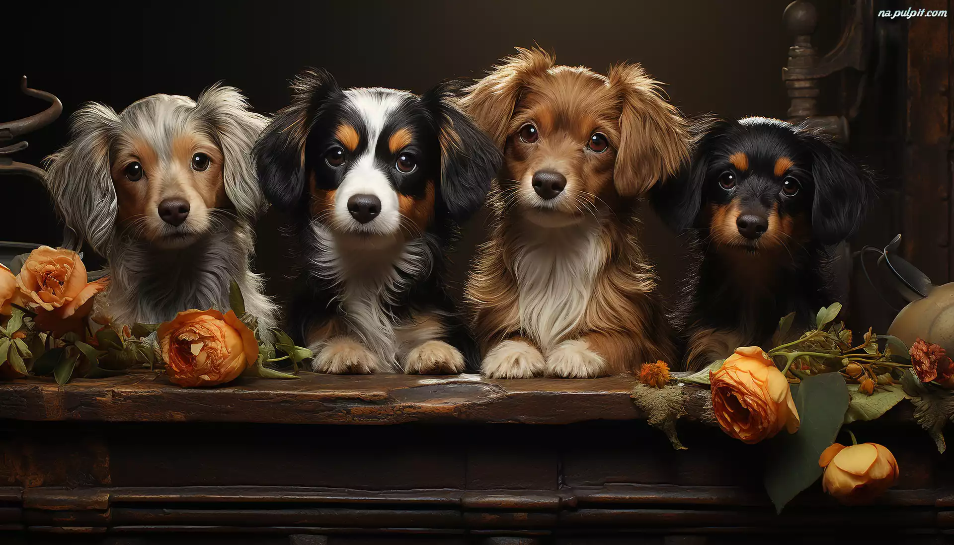 Kwiaty, Cztery, Psy, Róże, Szczeniaki Na Pulpit