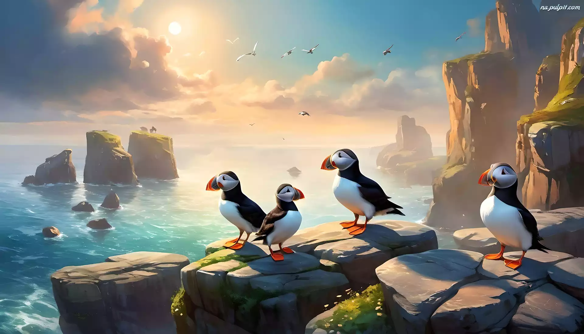 Skała, Cztery, Ptaki, Grafika, Maskonury Na Pulpit