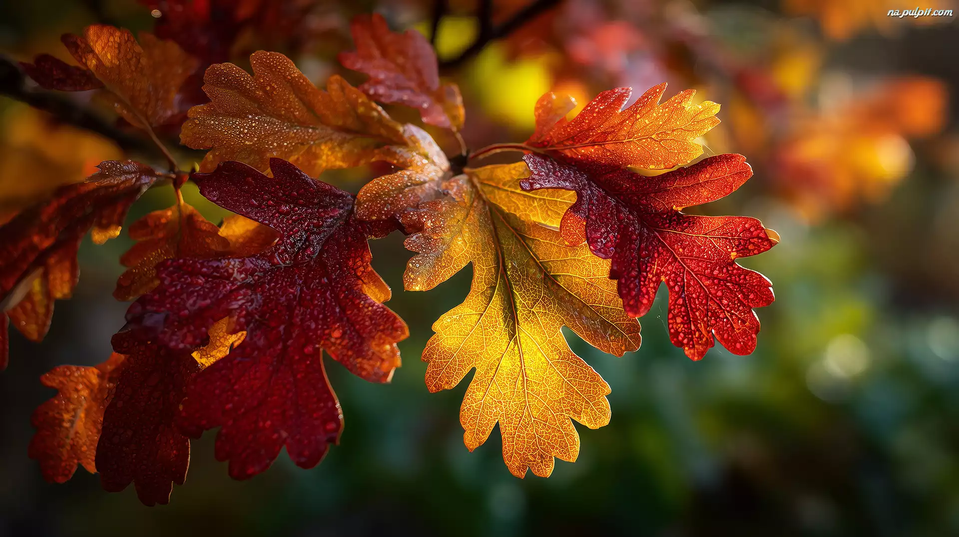 Krople, Liście, Dębowe, Dąb, Jesienne, Grafika AI Na Pulpit