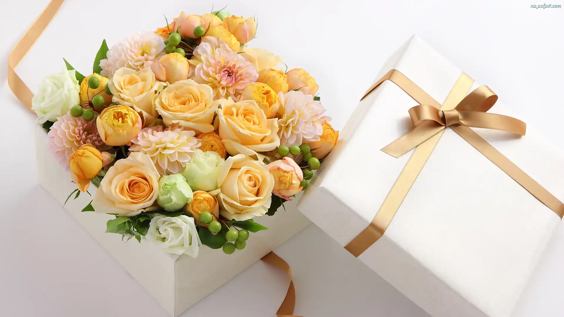 Dalie, Tasiemka, Kokardka, Pudełko, Róże, Prezent