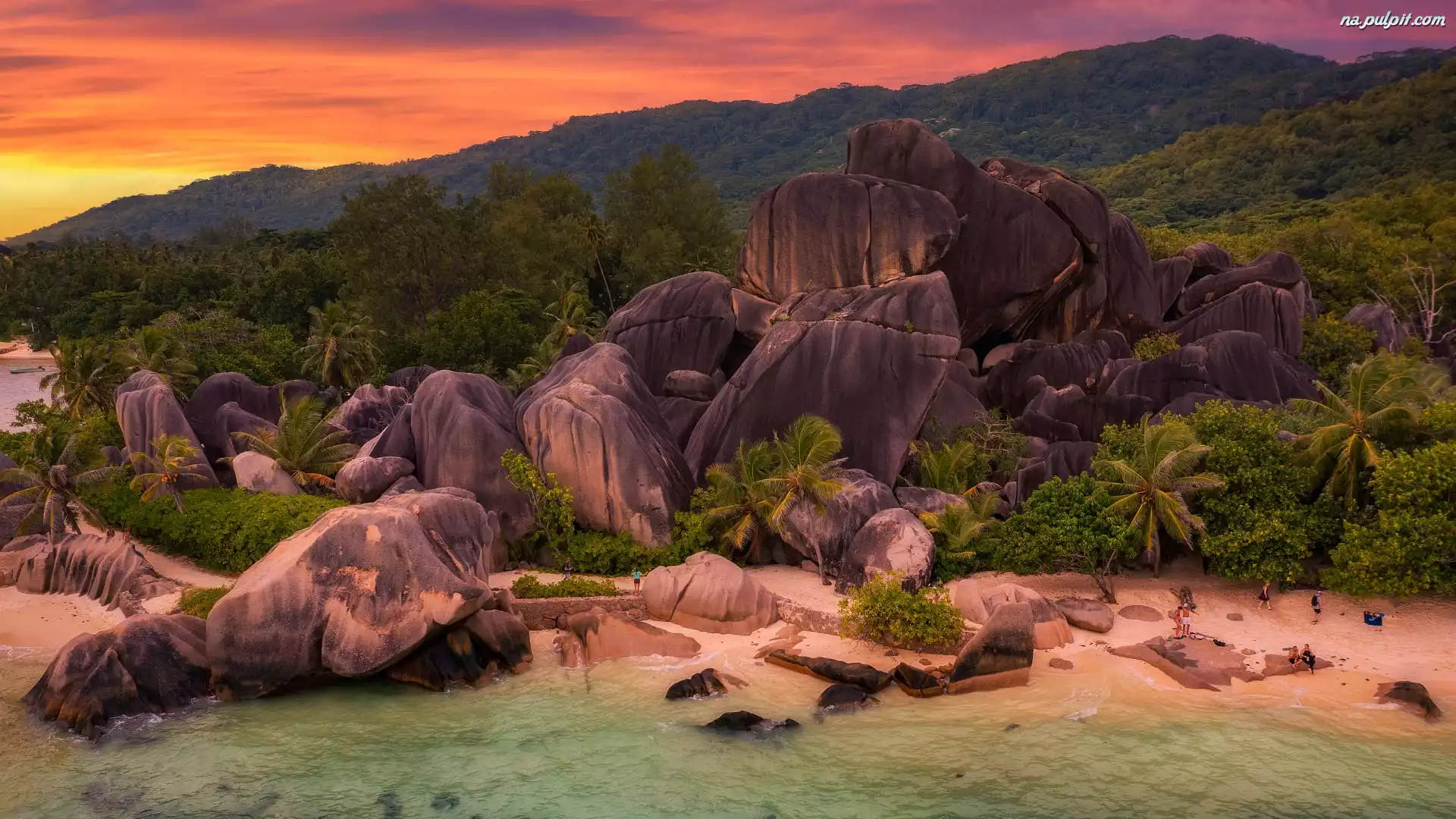 Palmy, Wyspa, Zachód słońca, Góry, Morze, Anse Source dArgent, Seszele, La Digue, Plaża, Skały Na Pulpit |