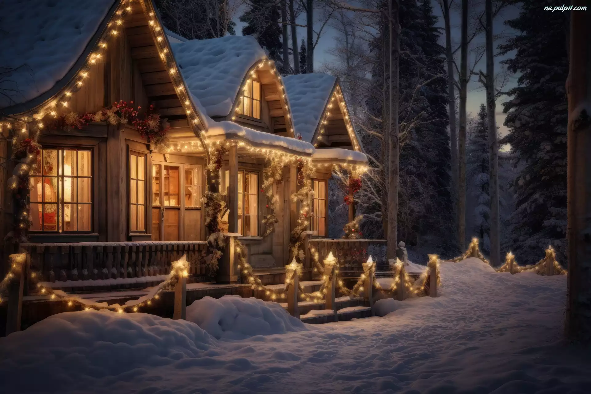 Las, Zima, Dom, Dekoracje, Boże Narodzenie, Drzewa